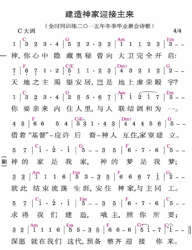 神的家是我家,神的梦是我梦;就此结束流荡生涯,安住神家,与主同工。求将我们建造,哦主,照你所要;深愿就在我们这代,预备整齐迎接你来。