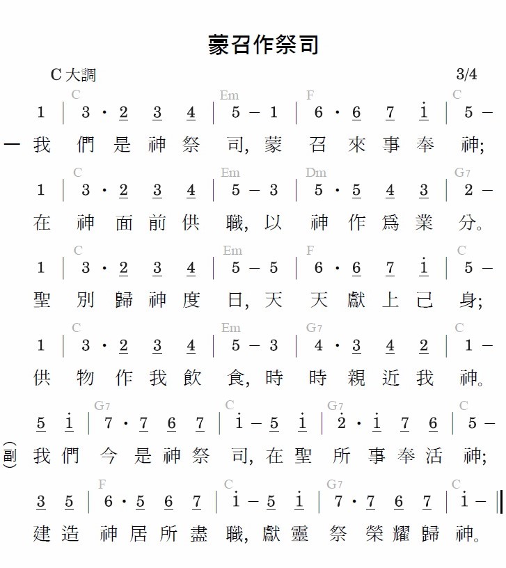我们是神祭司,蒙召来事奉神;在神面前供职,以神作为业分。圣别归神度日,天天献上己身;供物作我饮食,时时亲近我神。