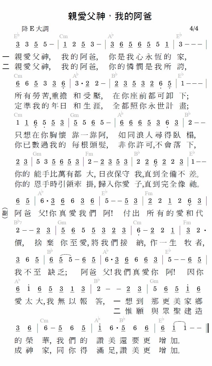 阿爸父!你真爱我们啊!付出所有的爱和代价,舍弃你至爱,将我们接纳,作一生牧者,我不至缺乏;阿爸父!我们真爱你啊!因你爱太大,我无以报答,惟愿与众圣建造成神家,同你得满足,赞美更增加。