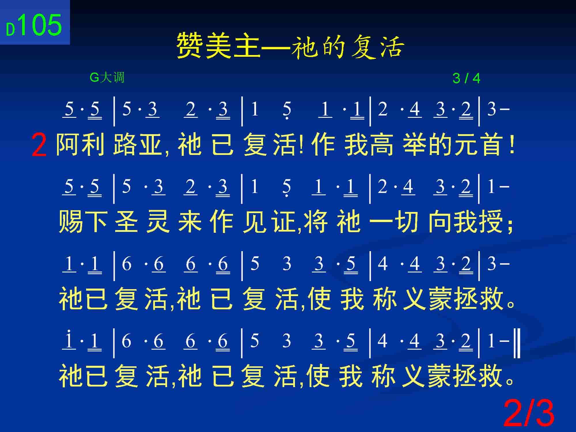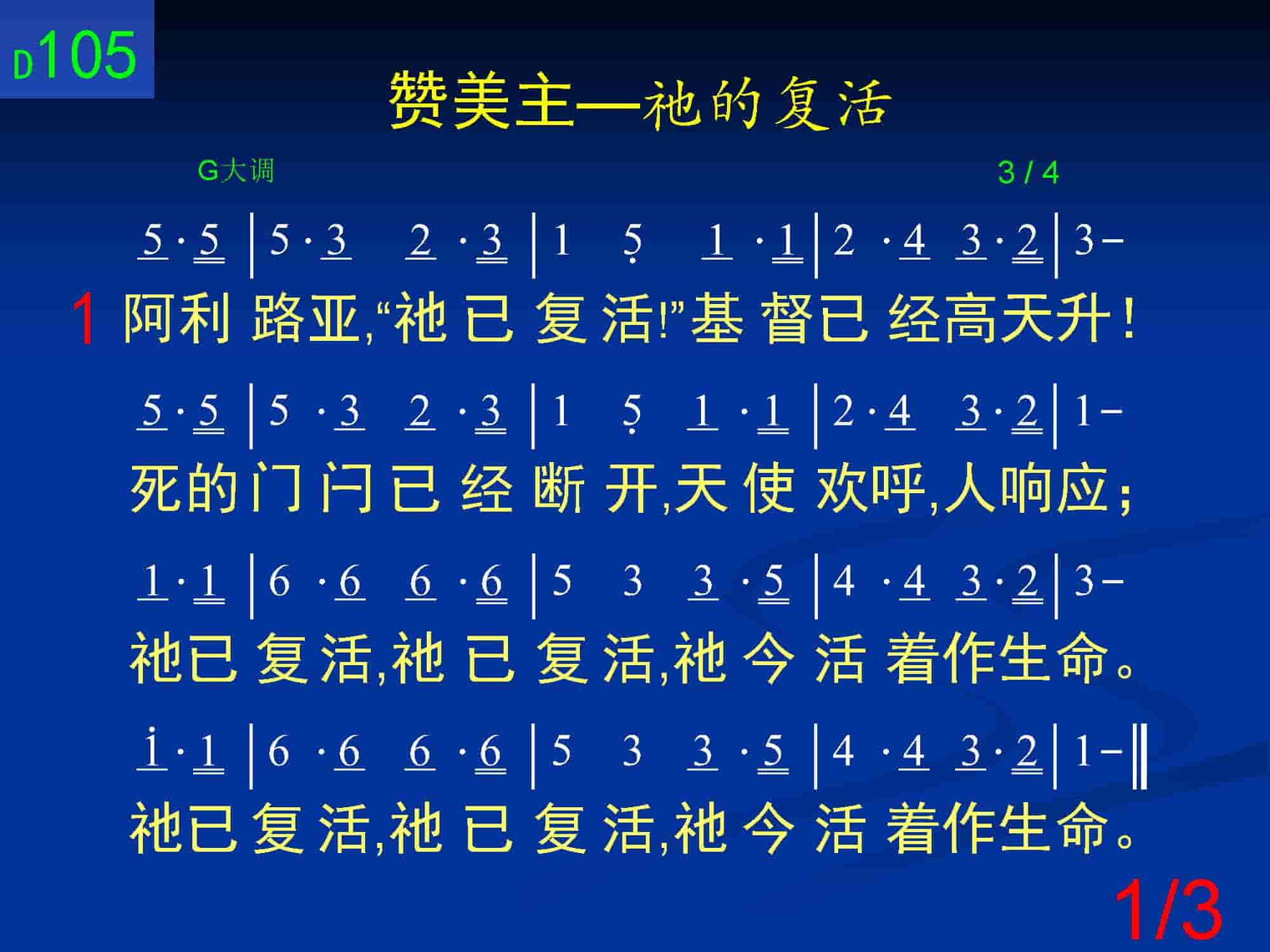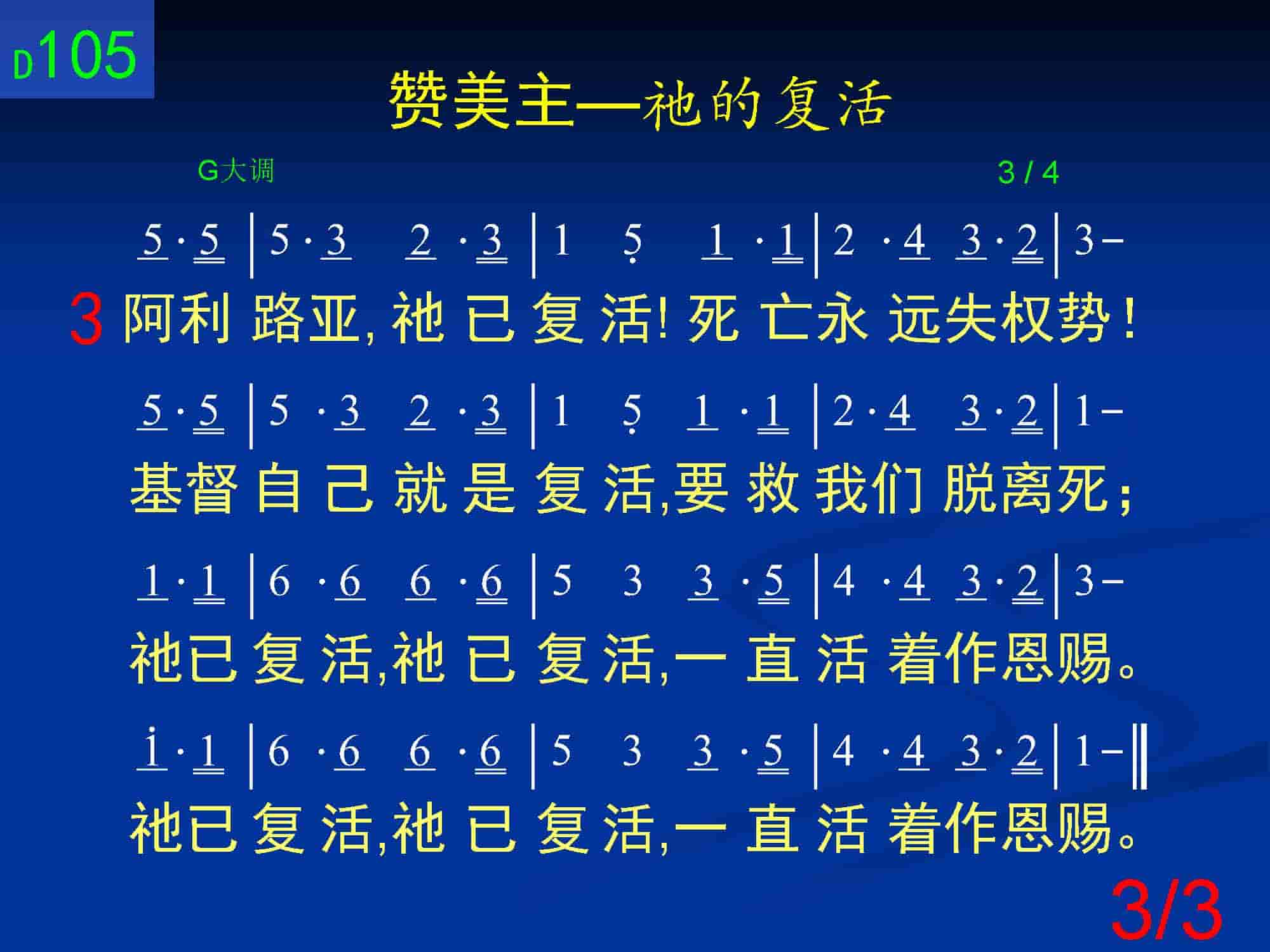 阿利路亚,祂已复活!死亡永远失权势!基督自己就是复活,要救我们脱离死;祂已复活,祂已复活,一直活著作恩赐。