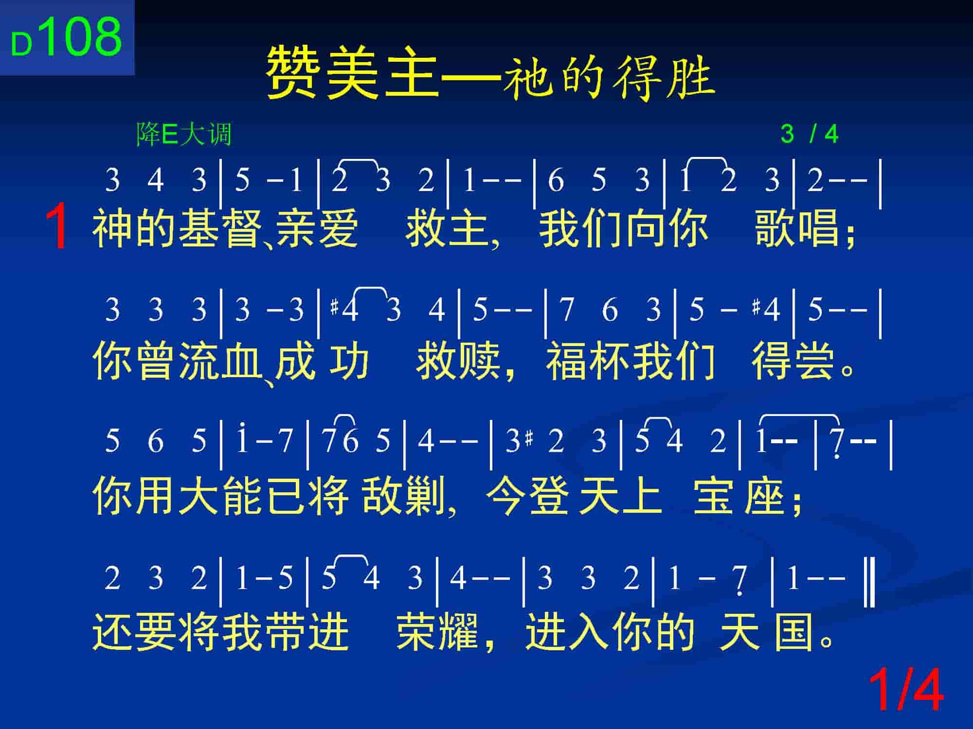 神的基督、亲爱救主,我们向你歌唱;你曾流血、成功救赎,福杯我们得尝。你用大能已将敌剿,今登天上宝座;还要将我带进荣耀,进入你的天国。