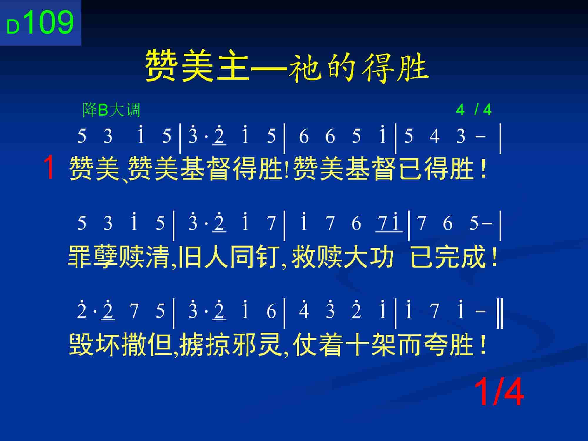 唱起这首赞美基督已得胜的诗歌,我们的灵实在能够响应出埃及记十五章一至十八节摩西所作赞美的歌!以色列人在过了红海,看见神将追赶他们的法老及其军兵淹没在海中,便赞美他们的神耶和华大大得胜!而基督如何成就祂荣耀的得胜呢?第一节赞美基督十架功绩的得胜:“赞美基督已得胜!罪孽赎清,旧人同钉,救赎大功已完成!毁坏撒但,掳掠邪灵,仗着十架而夸胜!”祂是“神的羔羊,除去世人之罪的!”(约一29)我们将祂在十架上所流出的宝血应用在身上,一切的罪孽就被赎清,正如以色列人在离开埃及当夜,待在门框、门楣涂了羊羔之血的屋子里,便逃避了神的击杀。不仅如此,我们的旧人也已经与祂同钉十字架,使罪的身体失效,叫我们不再作罪的奴仆(罗六6)。除完成救赎大功,主还胜过撒但及邪灵,这是神借着红海的水淹没法老(表征世界的王撒但)及其一切跟随者所表征的。正如希伯来二章十四节:“儿女既同有血肉之体,祂也照样亲自有分于血肉之体,为要借着死,废除那掌死权的,就是魔鬼。”歌罗西二章十五节:“既将执政的和掌权的脱下,神就把他们公然示众,仗着十字架在凯旋中向他们夸胜。”所向我们揭示的。