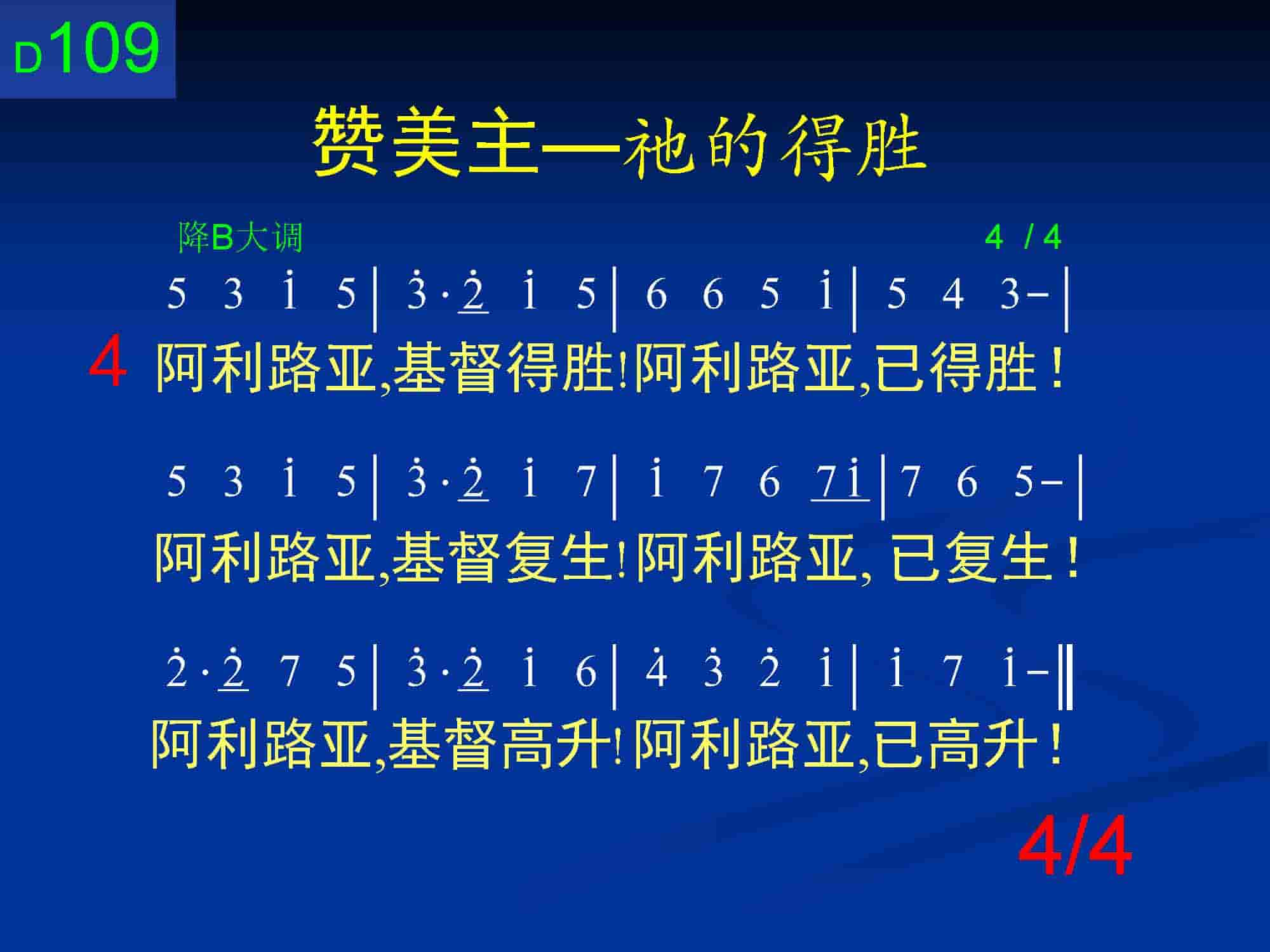 因此,我们岂能再闭口,理当高声赞美:“阿利路亚,基督得胜!阿利路亚,已得胜!阿利路亚,基督复生!阿利路亚,已复生!阿利路亚,基督高升!阿利路亚,已高升!”(第四节)