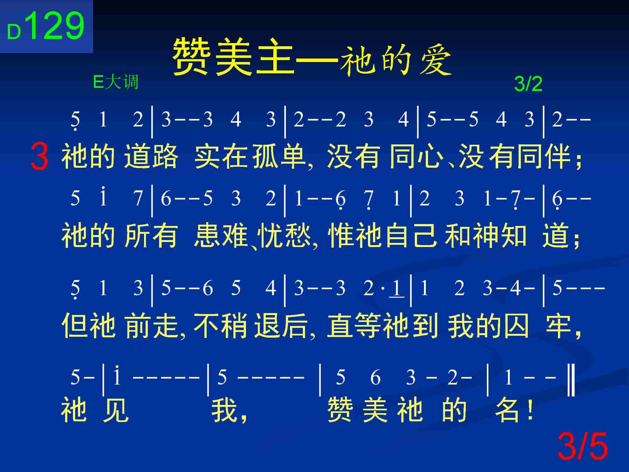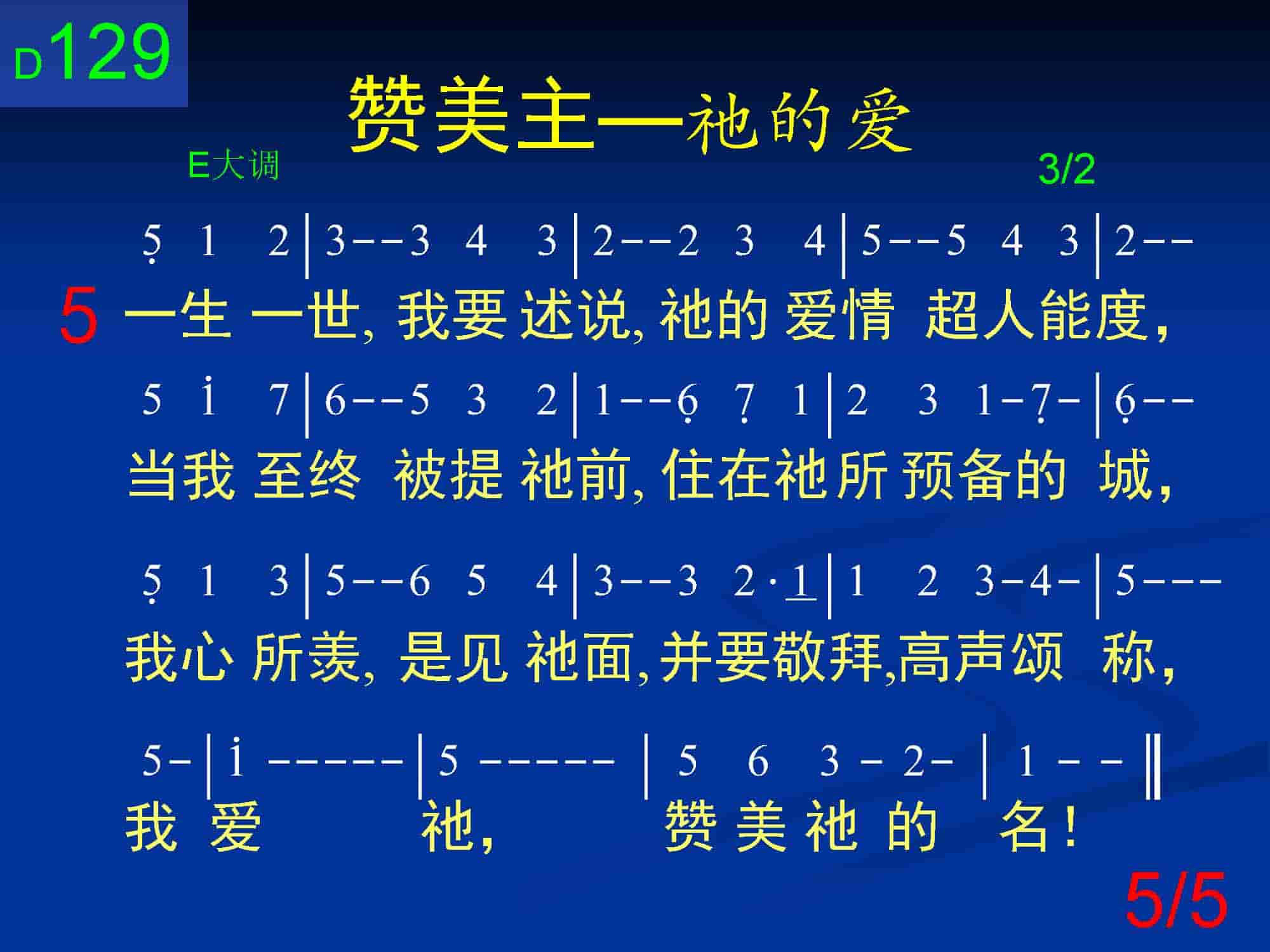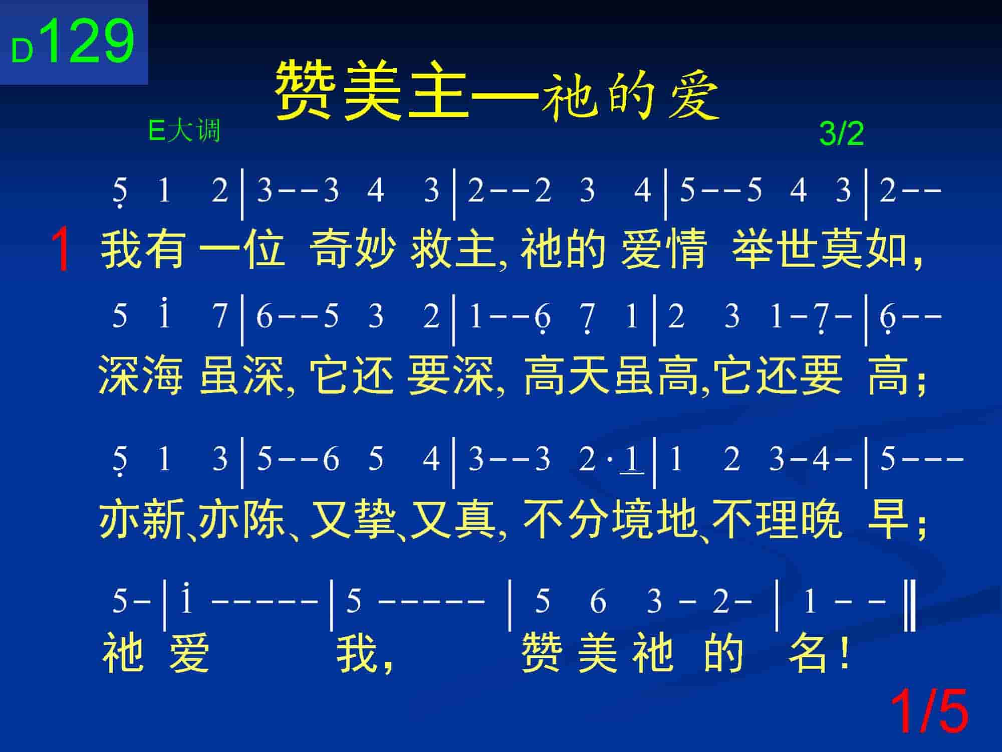 我有一位奇妙救主,祂的爱情举世莫如,深海虽深,它还要深,高天虽高,它还要高;亦新、亦陈、又挚、又真,不分境地、不理晚早;祂爱我,赞美祂的名!
