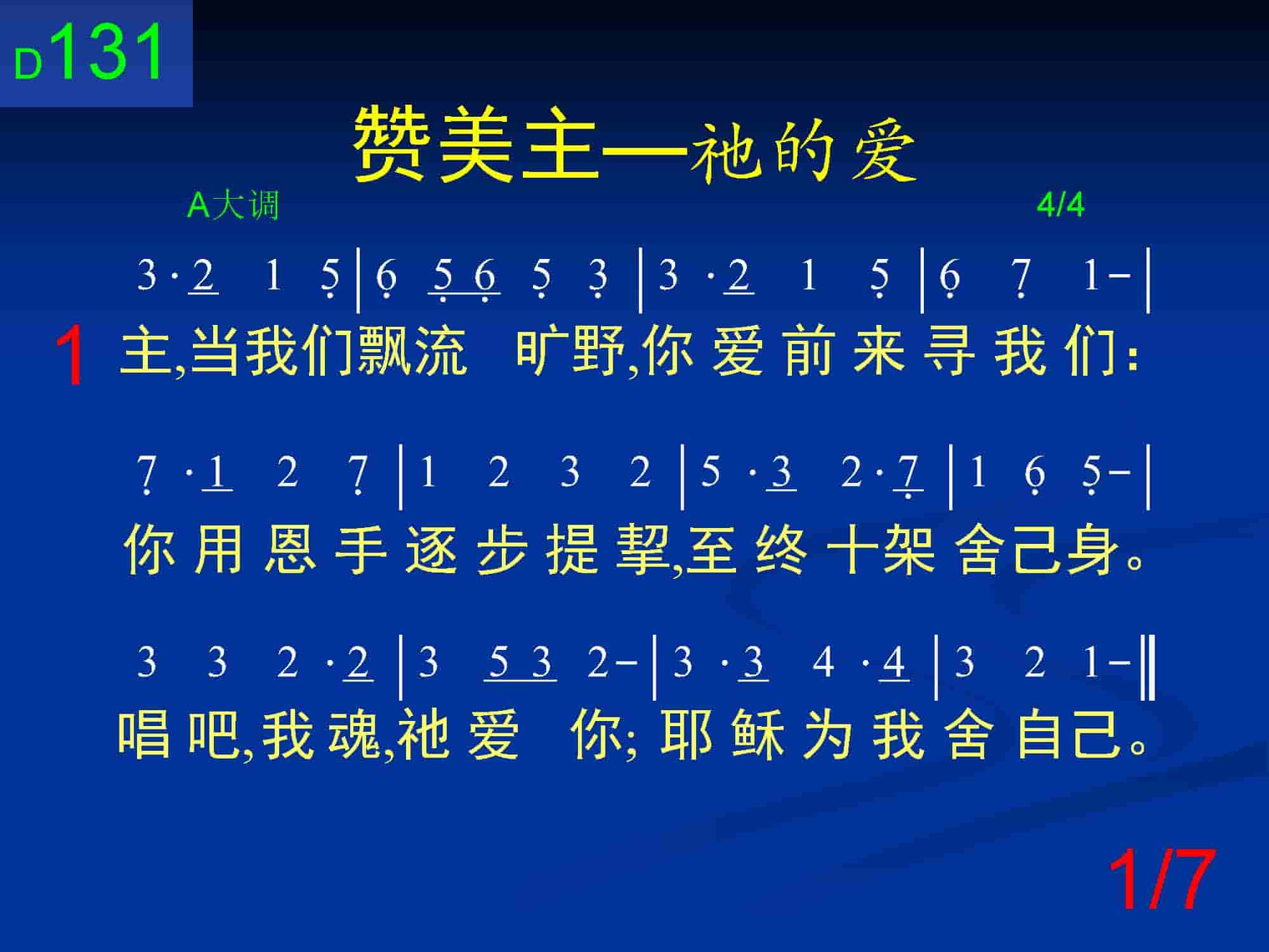 主,当我们飘流旷野,你爱前来寻我们:你用恩手逐步提挈,至终十架舍己身。唱罢,我魂,祂爱你;耶稣为我舍自己。