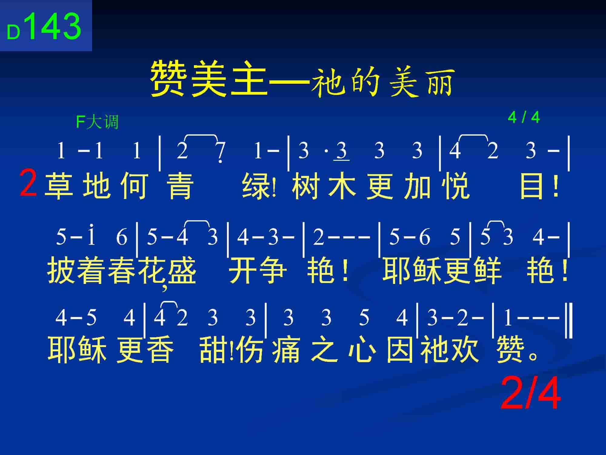 草地何青绿!树木更加悦目!披着春花,盛开争艳!耶稣更鲜艳!耶稣更香甜!伤痛之心因祂欢赞。