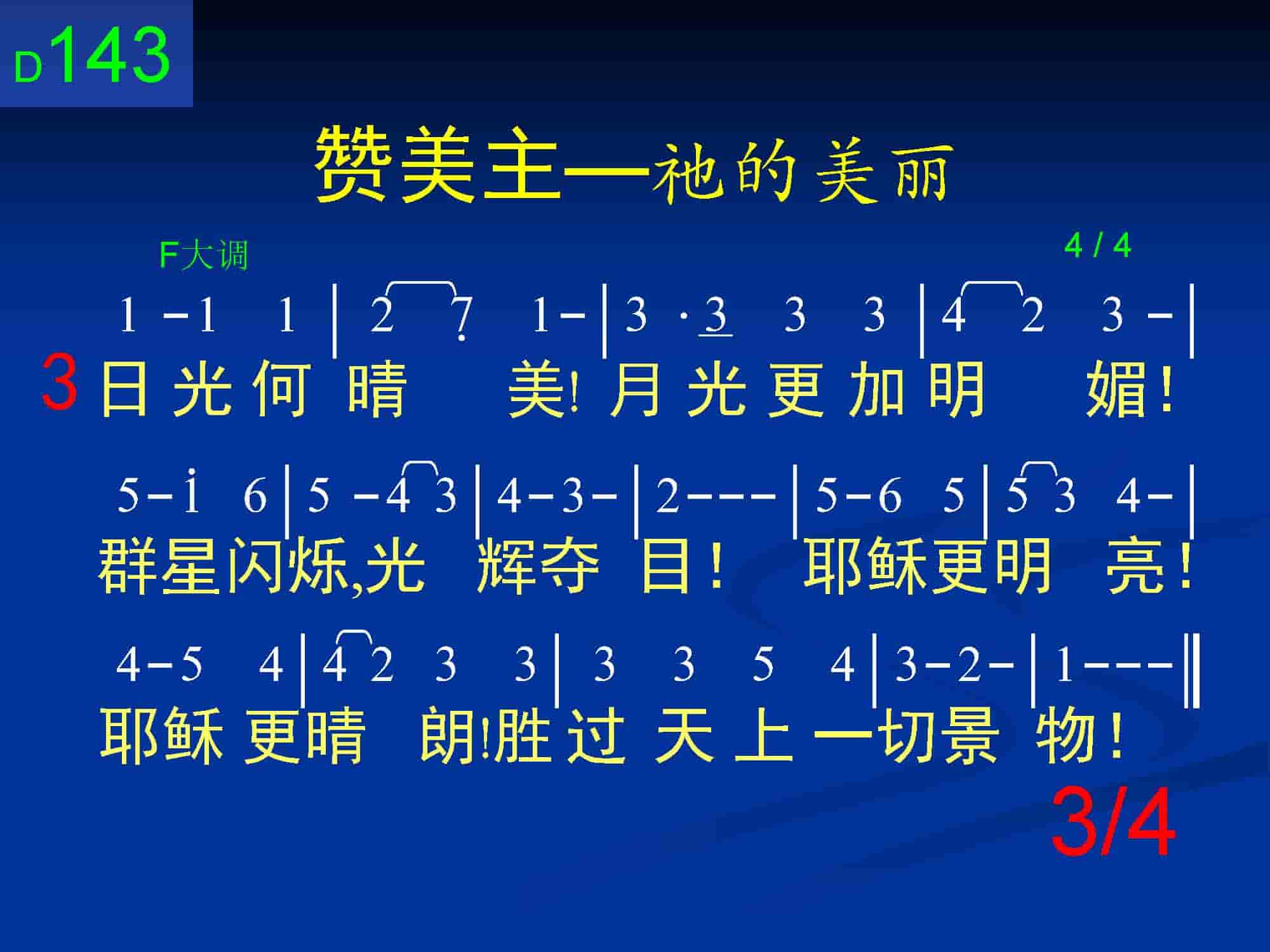 日光何晴美!月光更加明媚!群星闪烁,光辉夺目!耶稣更明亮!耶稣更晴朗!胜过天上一切景物!