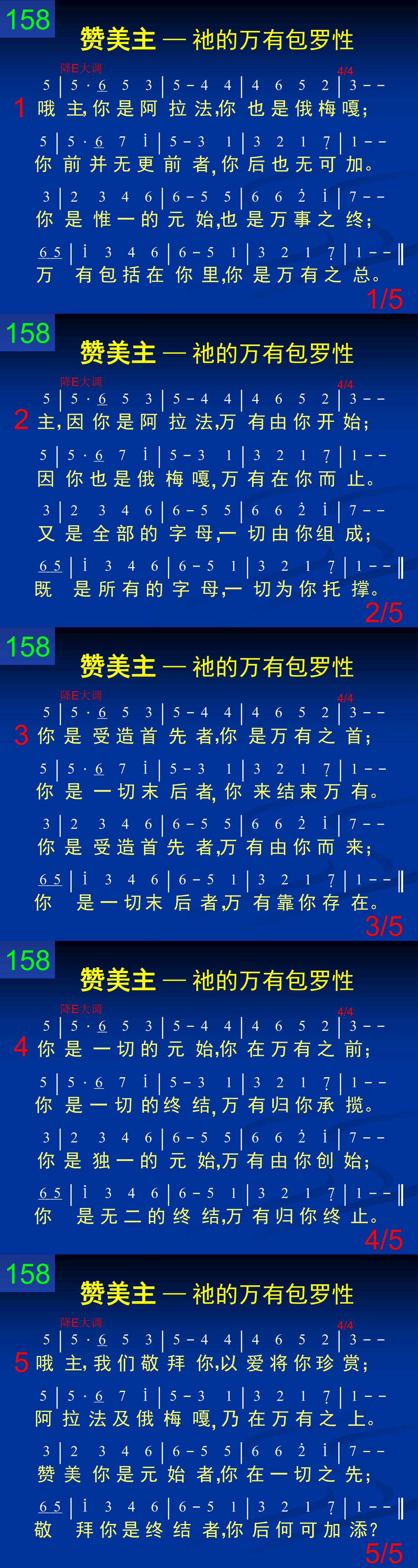 哦主,我们敬拜你,以爱将你珍赏;阿拉法及俄梅嘎,乃在万有之上。赞美你是元始者,你在一切之先;敬拜你是终结者,你后何可加添?