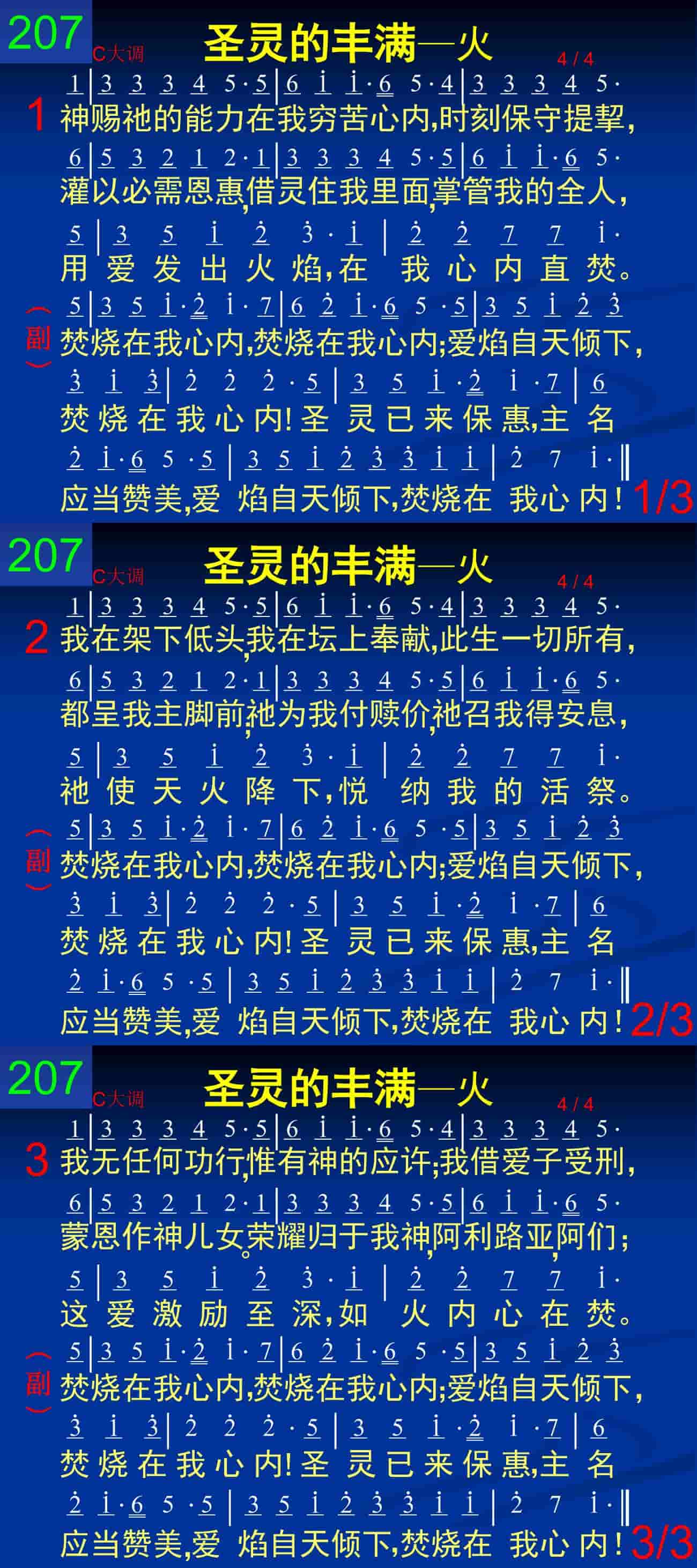 焚烧在我心内,焚烧在我心内;爱焰自天倾下,焚烧在我心内!圣灵已来保惠,主名应当赞美,爱焰自天倾下,焚烧在我心内!
