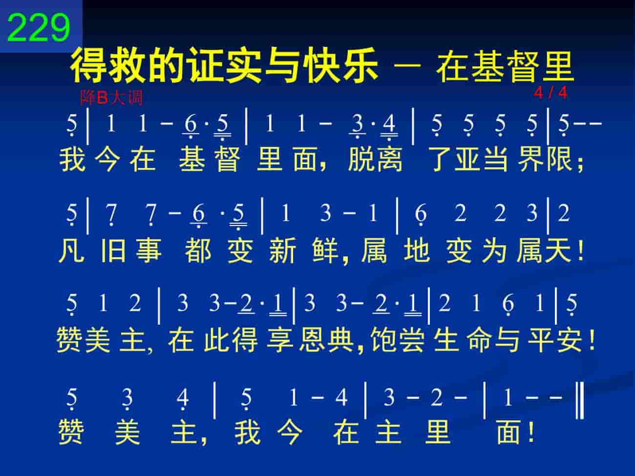 我今在基督里面,脱离了亚当界限;凡旧事都变新鲜,属地变为属天!赞美主,在此得享恩典,饱尝生命与平安!赞美主,我今在主里面!