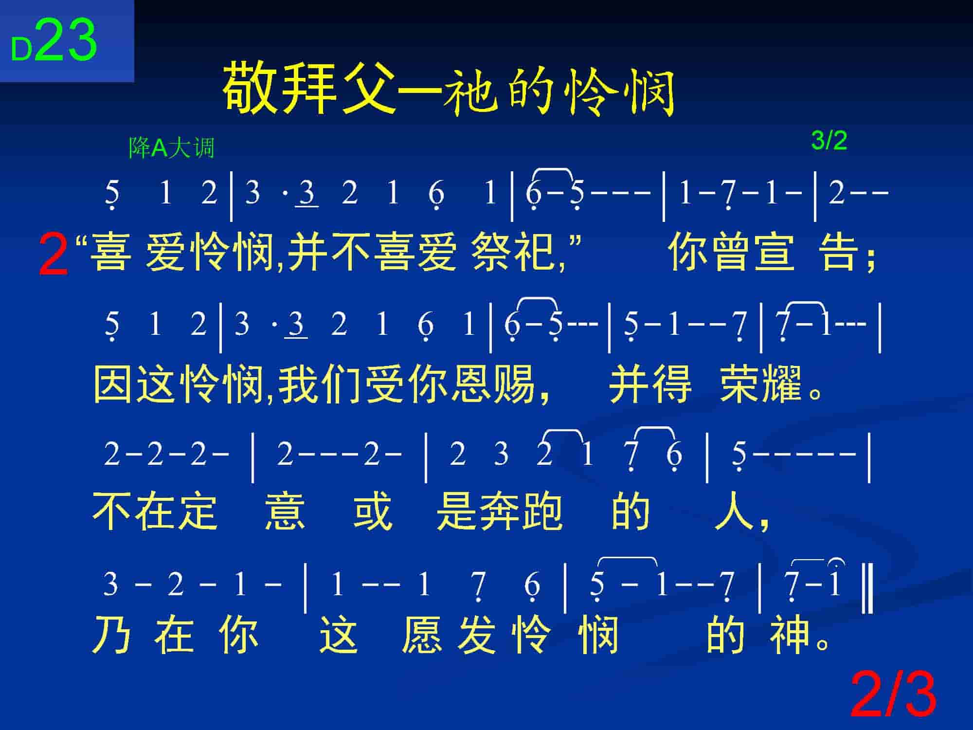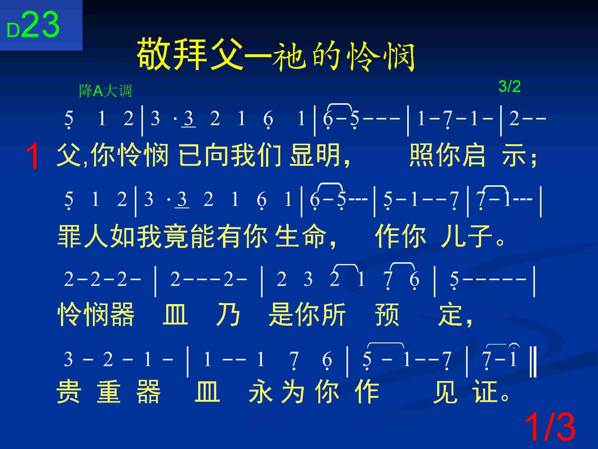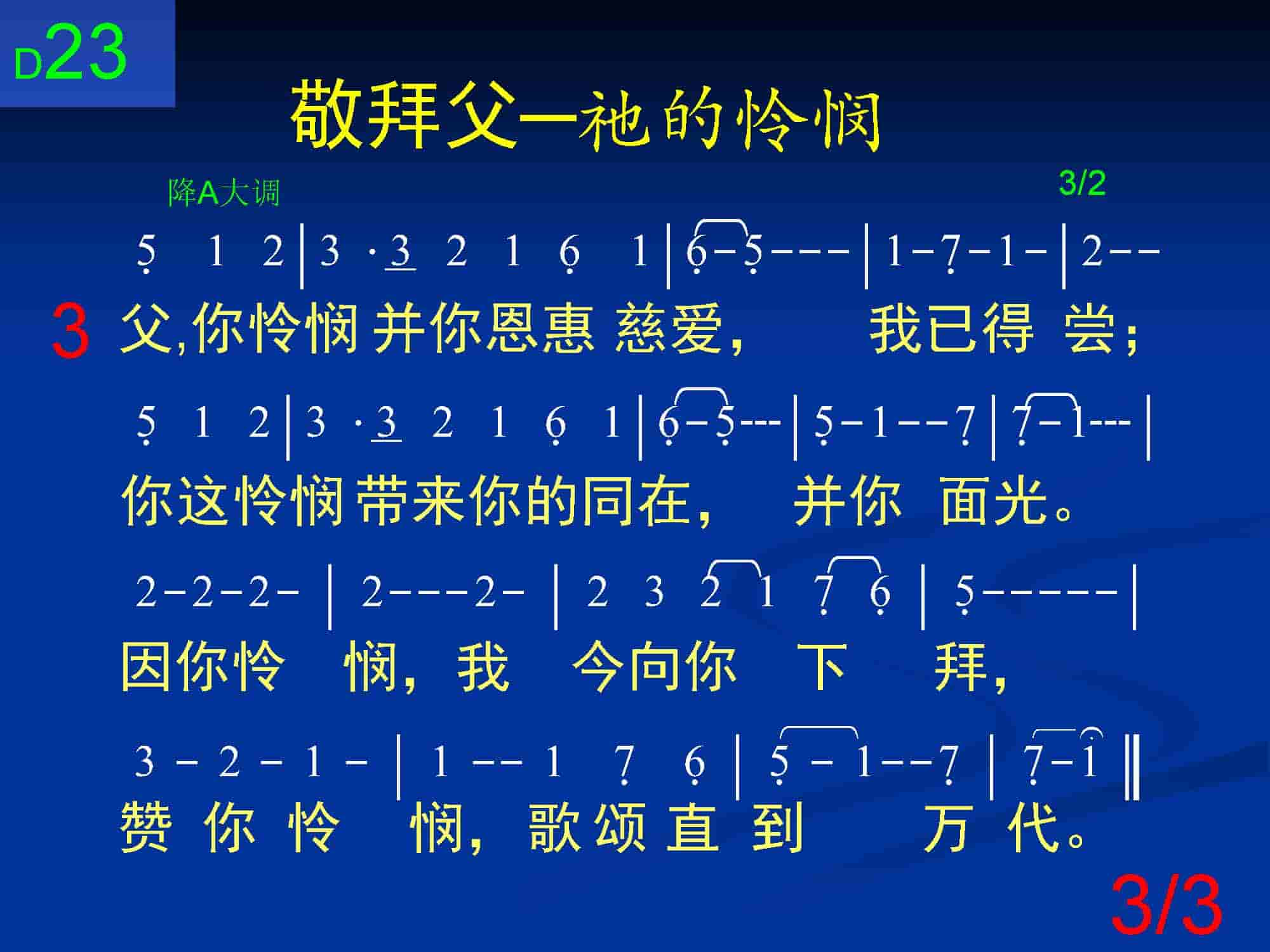 父,你怜悯并你恩惠、慈爱,我已得尝;你这怜悯带来你的同在,并你面光。因你怜悯,我今向你下拜,赞你怜悯,歌颂直到万代。