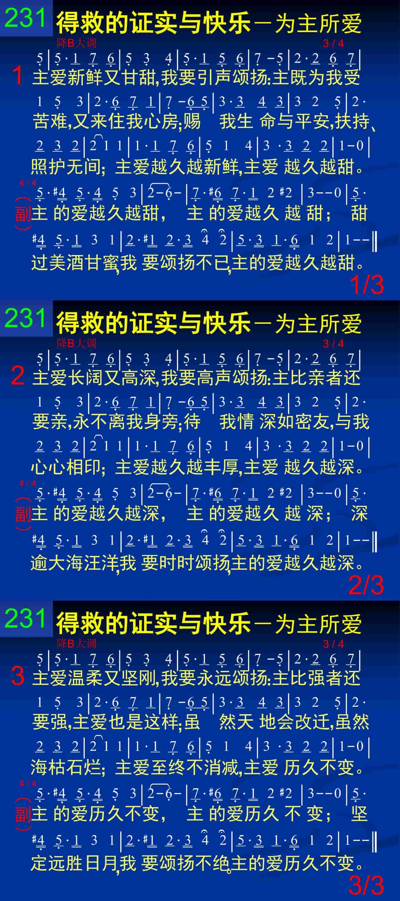 主的爱越久越甜,主的爱越久越甜;甜过美酒甘蜜,我要颂扬不已,主的爱越久越甜。