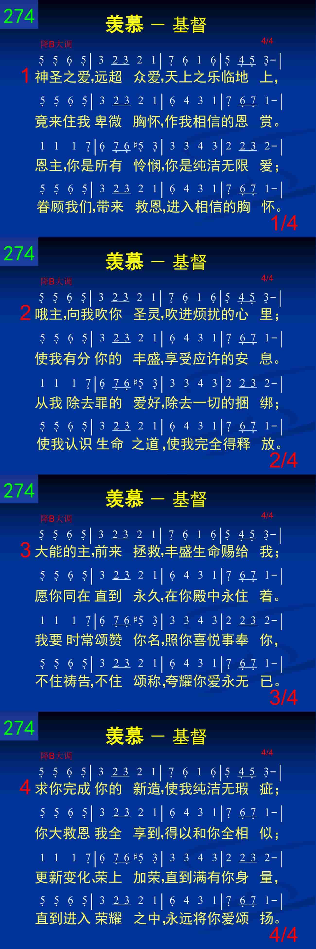 神圣之爱,远超众爱,天上之乐临地上,竟来住我卑微胸怀,作我相信的恩赏。恩主,你是所有怜悯,你是纯洁无限爱;眷顾我们,带来救恩,进入相信的胸怀。