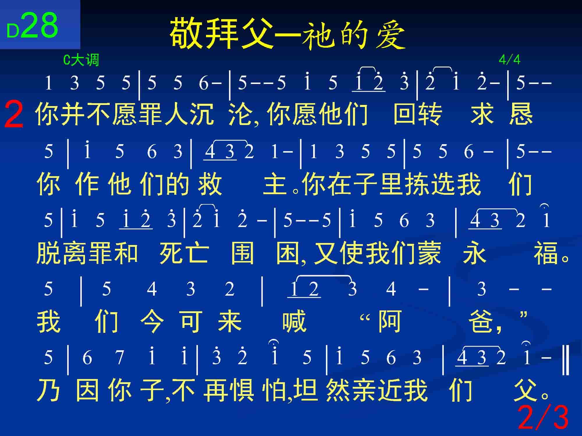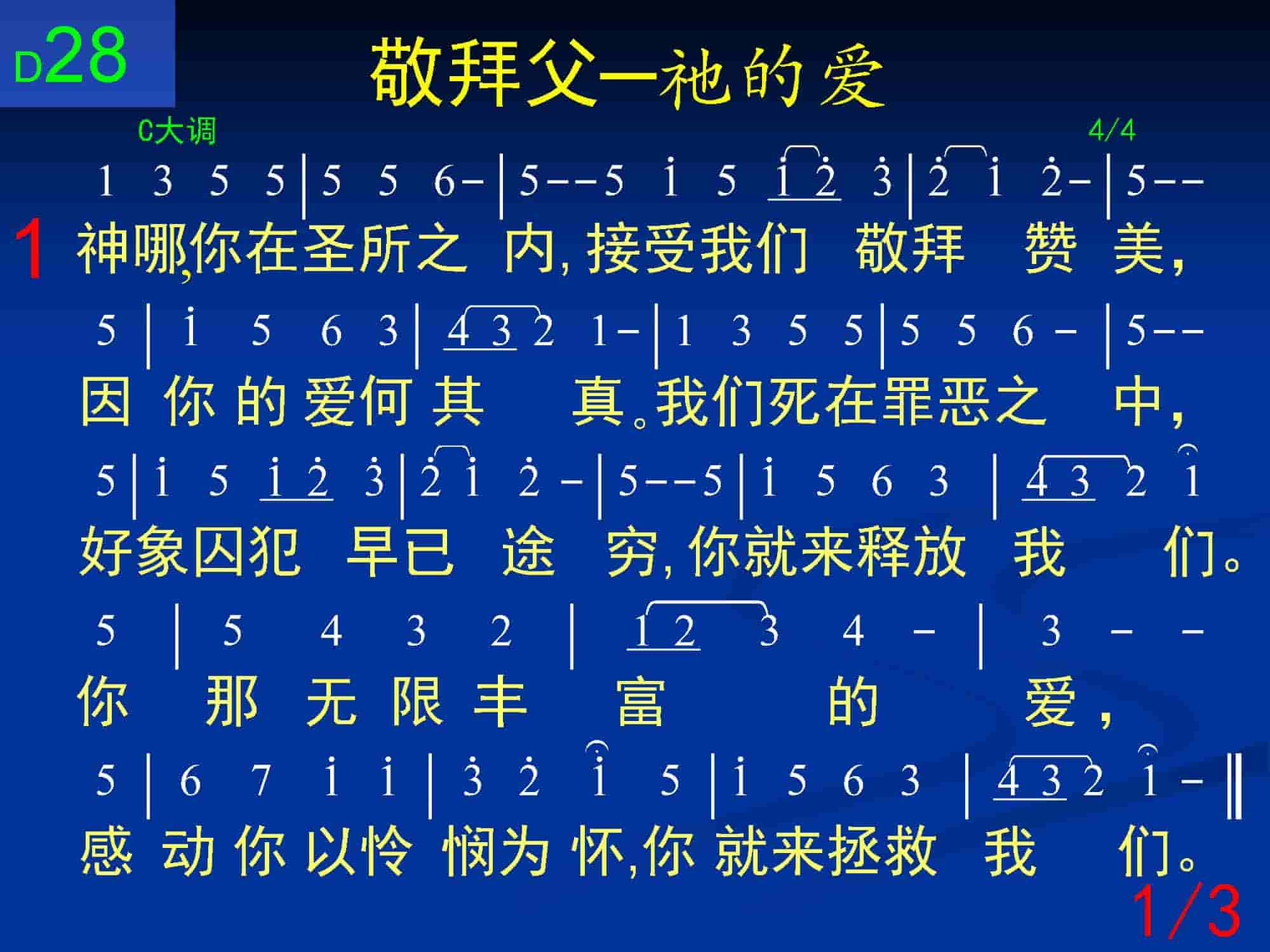 神哪,你在圣所之内,接受我们敬拜赞美,因你的爱何其真。我们死在罪恶之中,好像囚犯早已途穷,你就来释放我们。你那无限丰富的爱,感动你以怜悯为怀,你就来拯救我们。