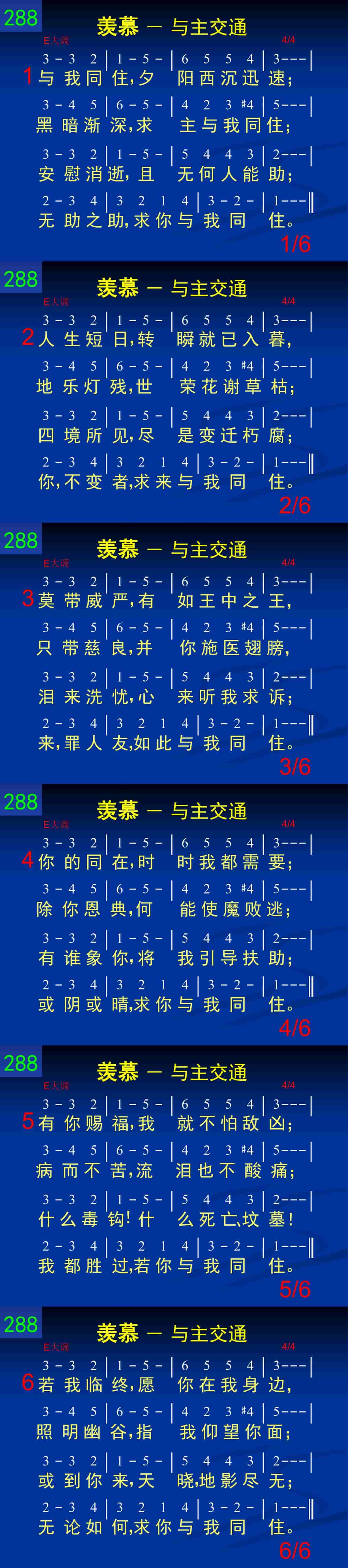 与我同住,夕阳西沉迅速;黑暗渐深,求主与我同住;安慰消逝,且无何人能助;无助之助,求你与我同住。