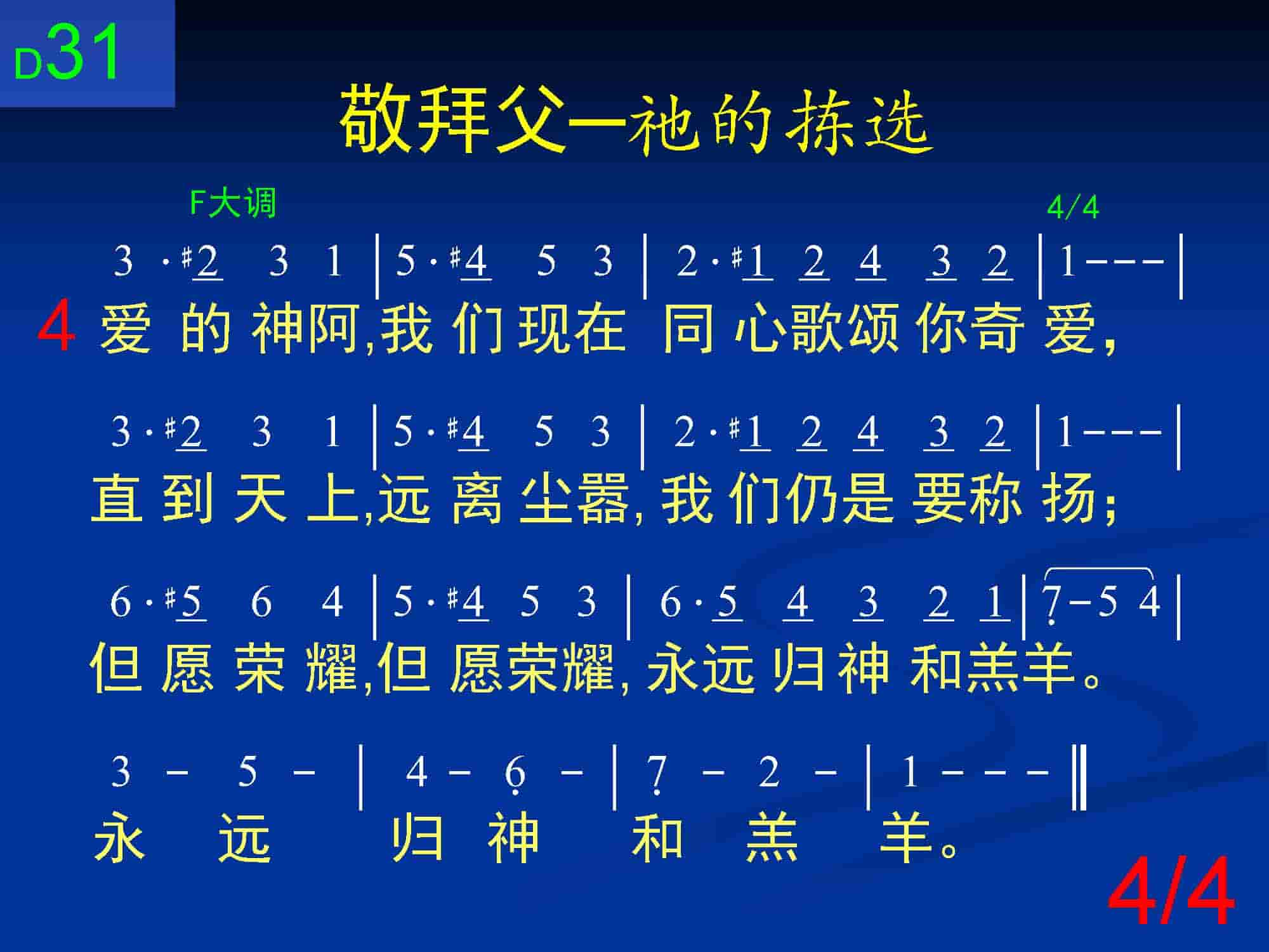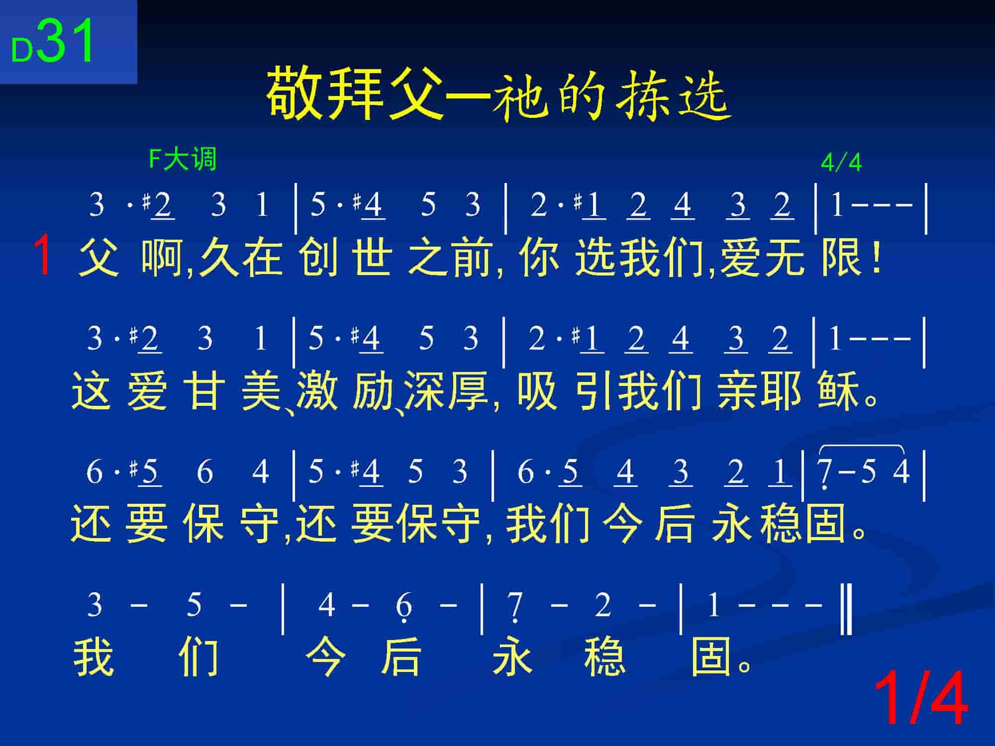 父啊,久在创世之前,你选我们,爱无限!这爱甘美、激励、深厚,吸引我们亲耶稣。还要保守,还要保守,我们今后永稳固。我们今后永稳固。