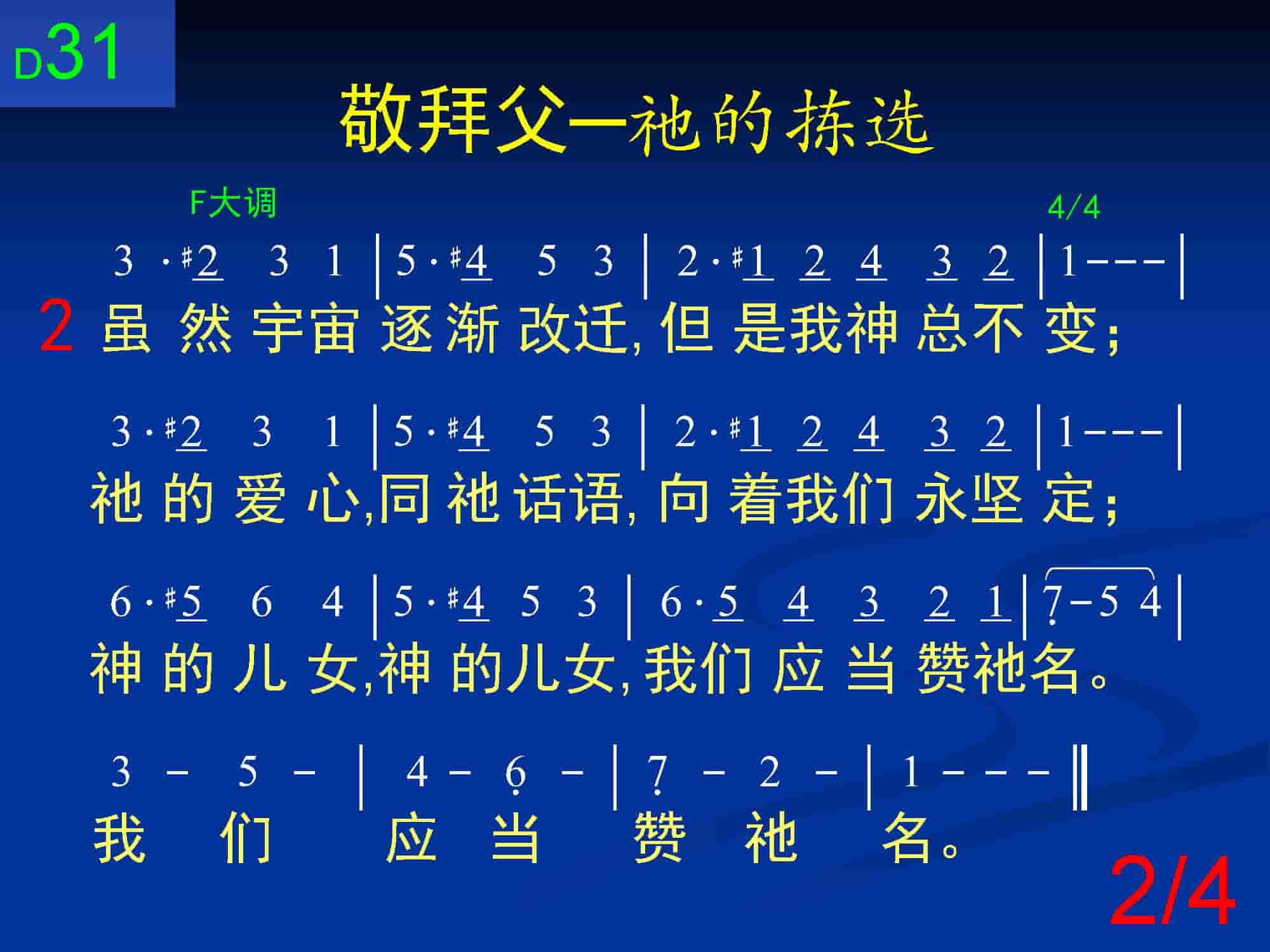 虽然宇宙逐渐改迁,但是我神总不变;祂的爱心,同祂话语,向着我们永坚定;神的儿女,神的儿女,我们应当赞祂名。我们应当赞祂名。