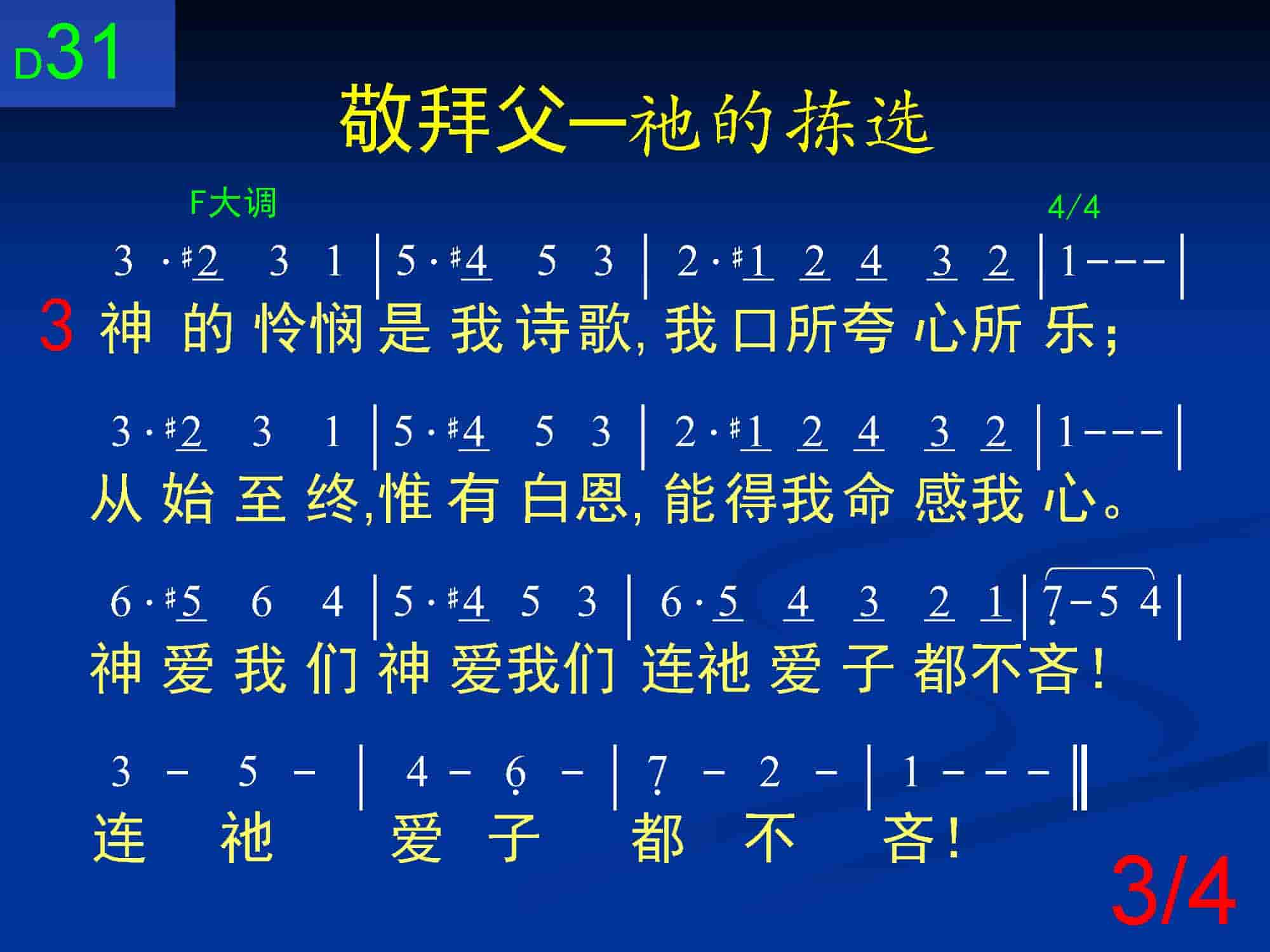 神的怜悯是我诗歌,我口所夸心所乐;从始至终,唯有白恩,能得我命感我心。神爱我们!神爱我们!连祂爱子都不吝!连祂爱子都不吝!