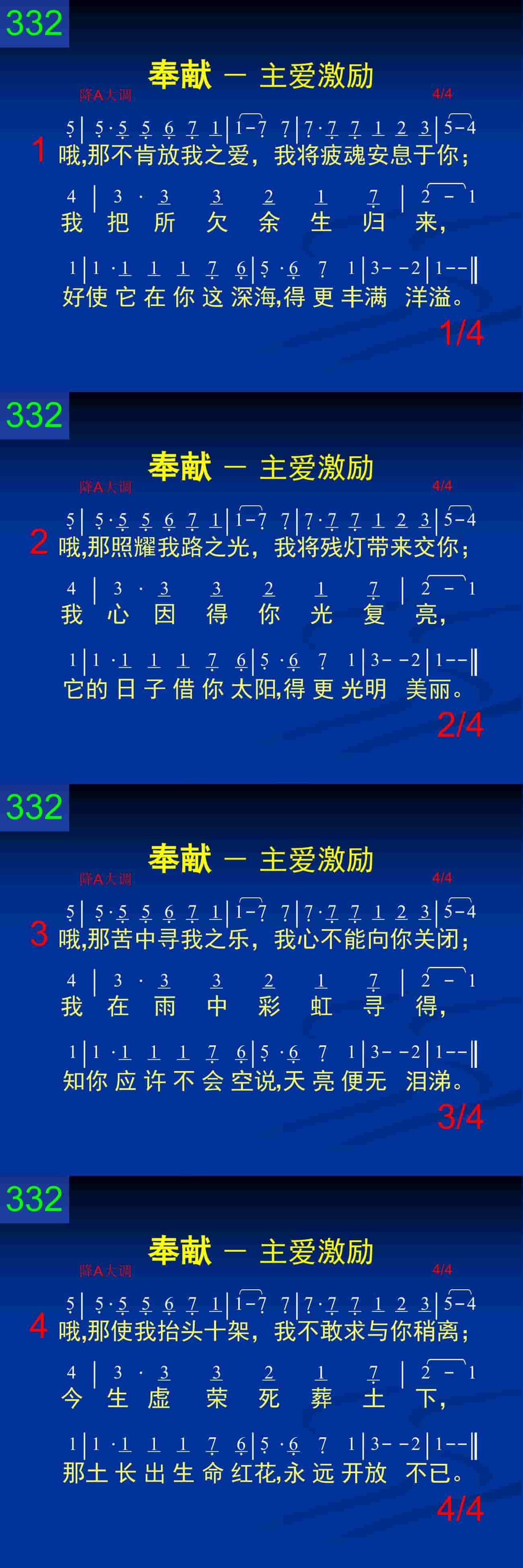 哦,那照耀我路之光,我将残灯带来交你;我心因得你光复亮,它的日子借你太阳,得更光明美丽。