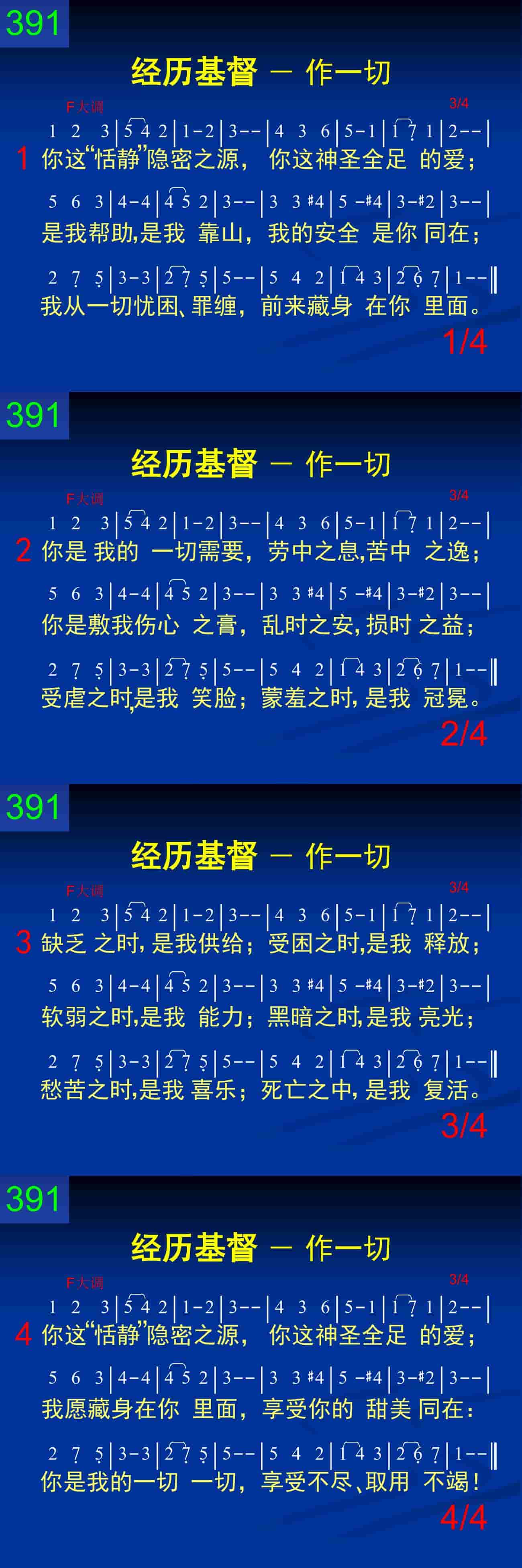 你这“恬静”隐密之源,你这神圣全足的爱;是我帮助,是我靠山,我的安全是你同在;我从一切忧困、罪缠,前来藏身在你里面。