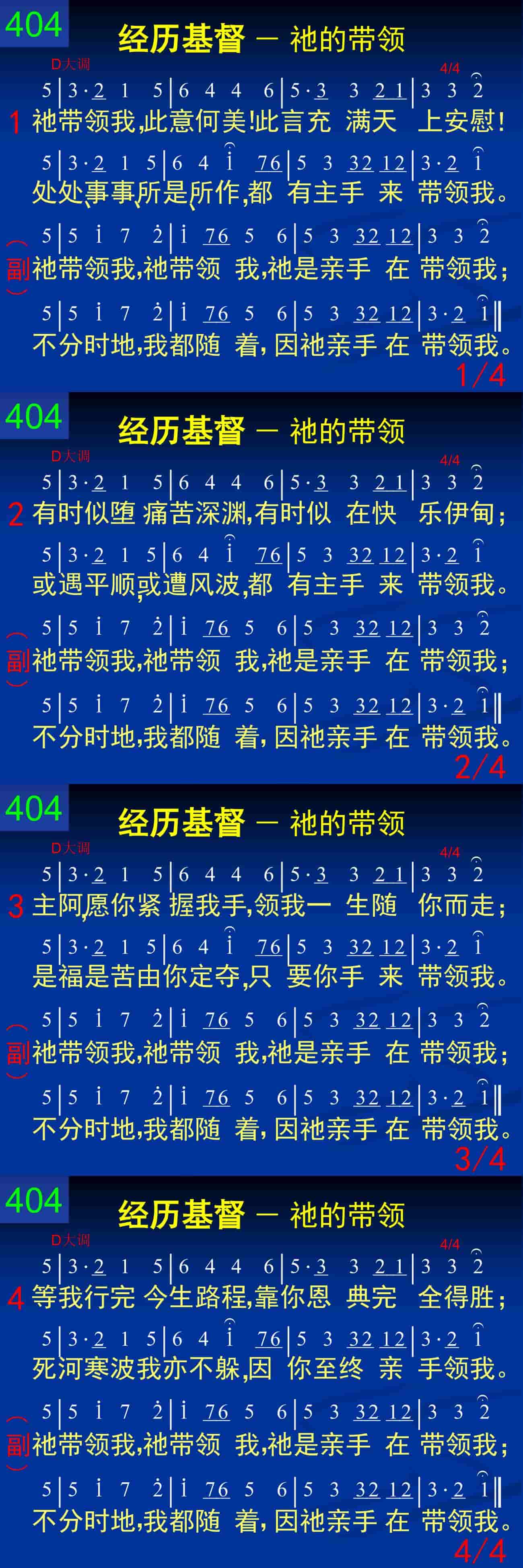 祂带领我,祂带领我,祂是亲手在带领我;不分时地,我都随着,因祂亲手在带领我。