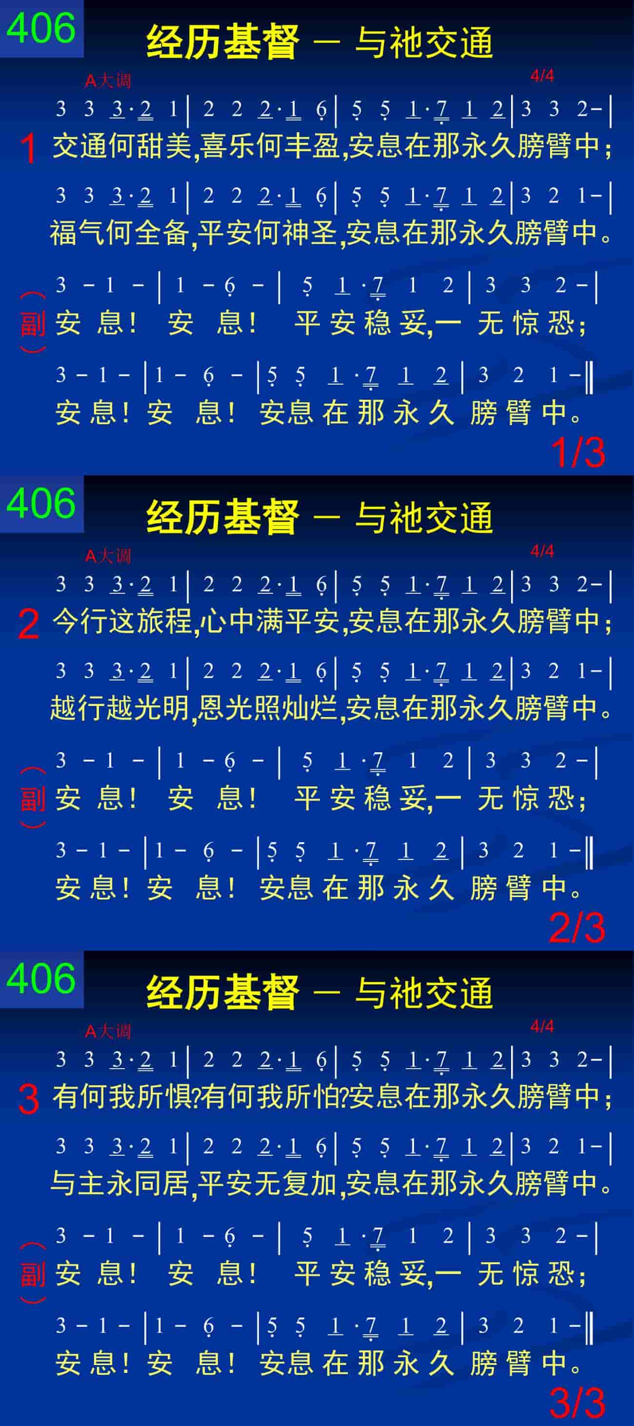 交通何甜美,喜乐何丰盈,安息在那永久膀臂中;福气何全备,平安何神圣,安息在那永久膀臂中。