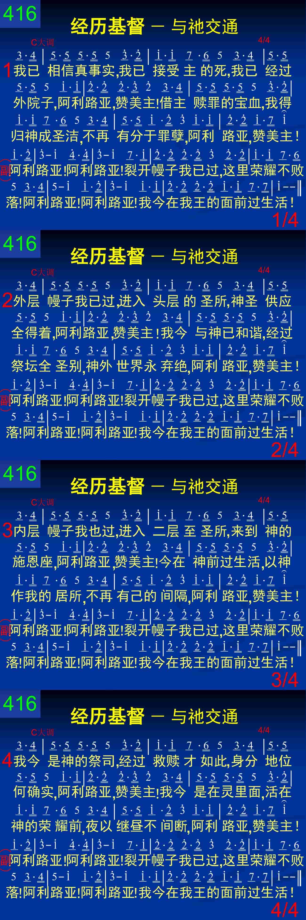 外层幔子我已过,进入头层的圣所,神圣供应全得着,阿利路亚,赞美主!我今与神已和谐,经过祭坛全圣别,神外世界永弃绝,阿利路亚,赞美主!