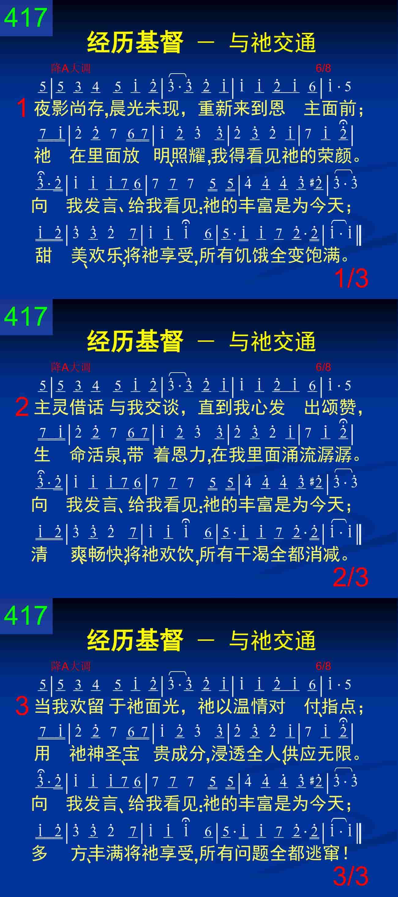 夜影尚存,晨光未现,重新来到恩主面前;祂在里面放明、照耀,我得看见祂的荣颜。向我发言、给我看见:祂的丰富是为今天;甜美、欢乐,将祂享受,所有饥饿全变饱满。