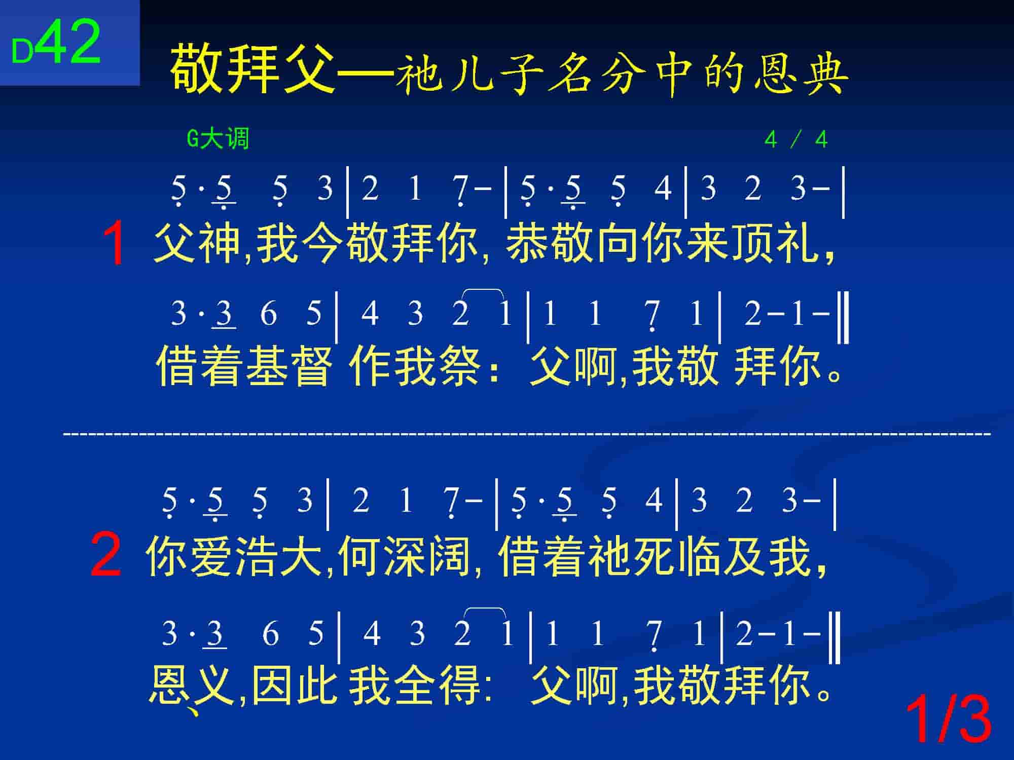 父神,我今敬拜你,恭敬向你来顶礼,借着基督作我祭:父啊,我敬拜你。