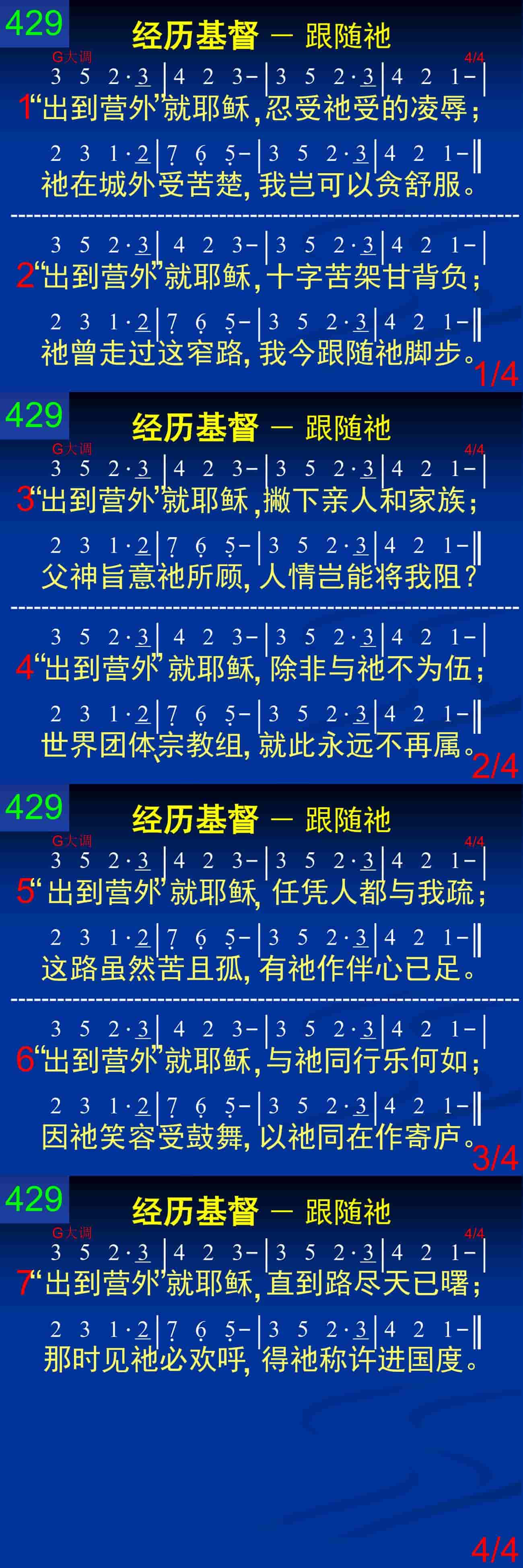“出到营外”就耶稣,十字苦架甘背负;祂曾走过这窄路,我今跟随祂脚步。