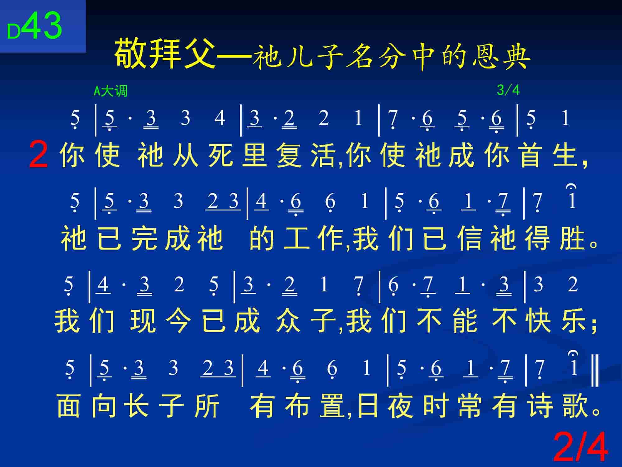 你使祂从死里复活,你使祂成你首生,祂已完成祂的工作,我们已信祂得胜。我们现今已成众子,我们不能不快乐;面向长子所有布置,日夜时常有诗歌。