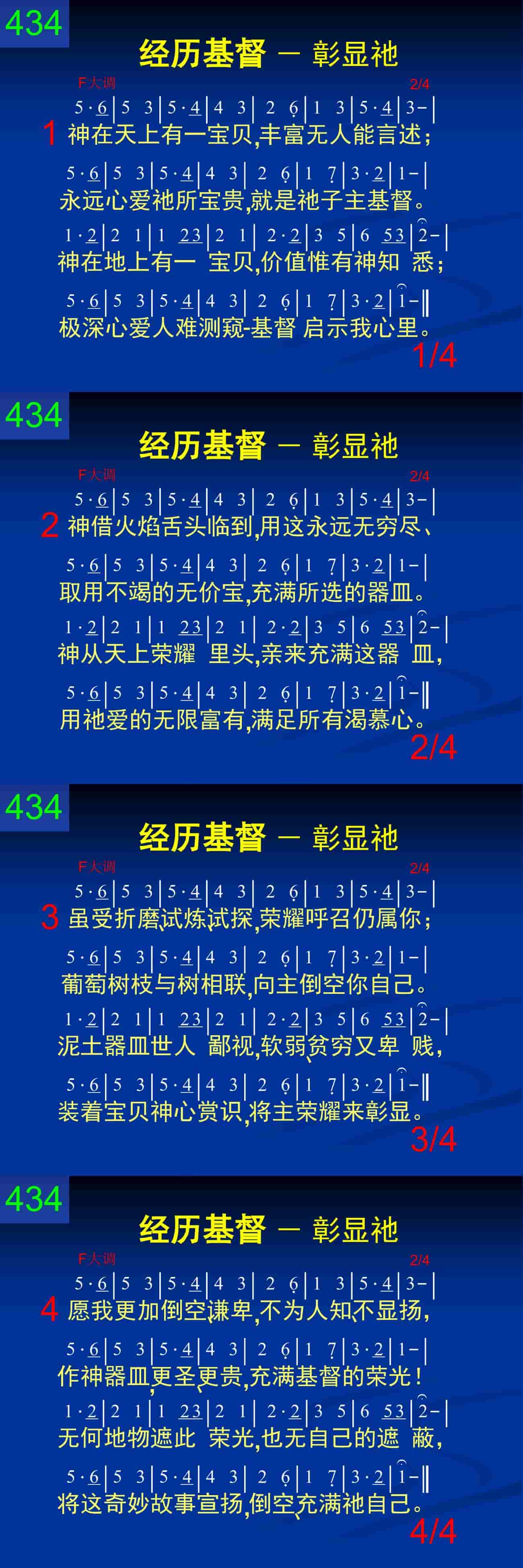 神在天上有一宝贝,丰富无人能言述;永远心爱祂所宝贵,就是祂子主基督。神在地上有一宝贝,价值唯有神知悉;极深心爱人难测窥——基督启示我心里。