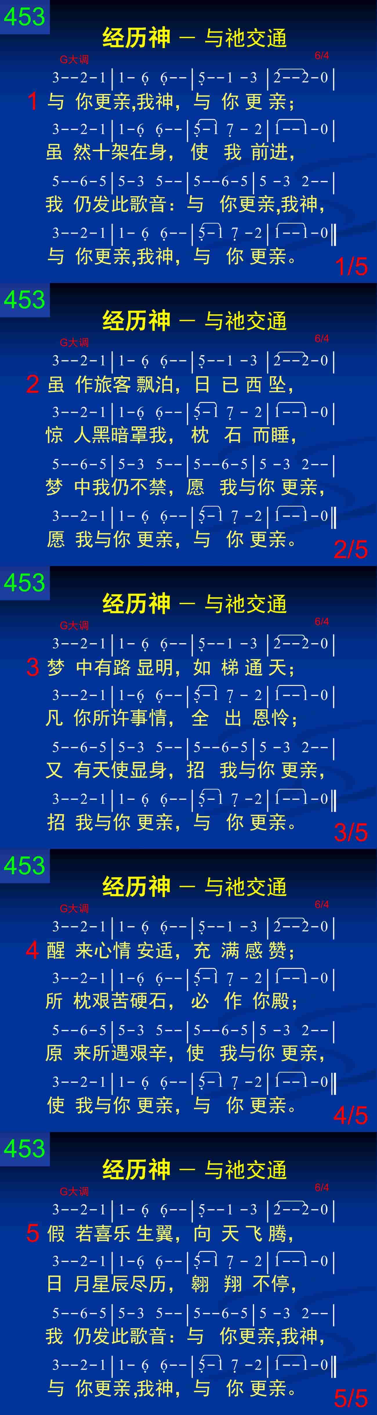 与你更亲,我神,与你更亲;虽然十架在身,使我前进,我仍发此歌音:与你更亲,我神,与你更亲,我神,与你更亲。