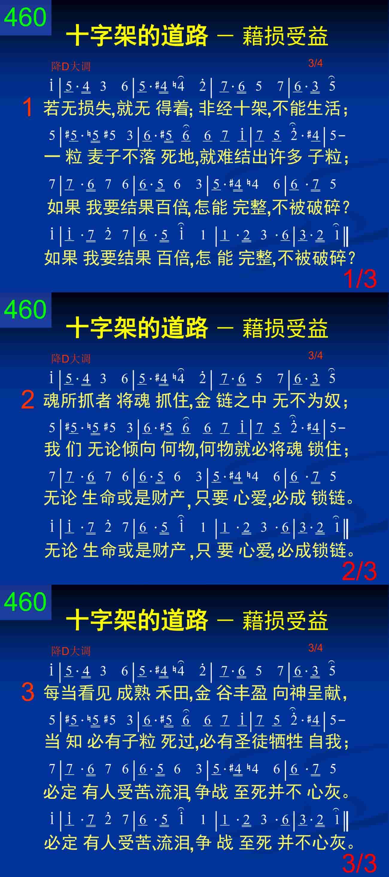 每当看见成熟禾田,金谷丰盈向神呈献,当知必有子粒死过,必有圣徒牺牲自我;必定有人受苦、流泪,争战至死并不心灰。必定有人受苦、流泪,争战至死并不心灰。