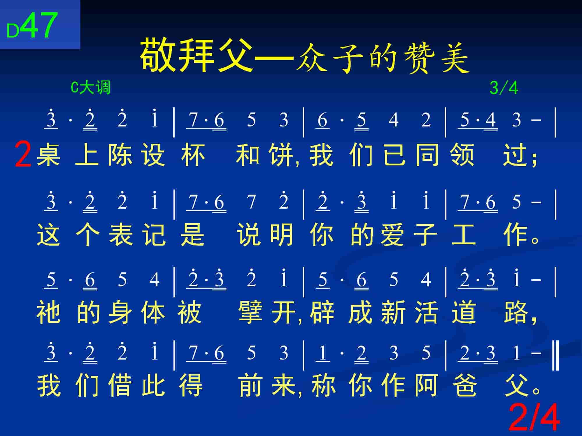 桌上陈设杯和饼,我们已同领过;这个表记是说明你的爱子工作。祂的身体被擘开,辟成新活道路,我们借此得前来,称你作阿爸父。