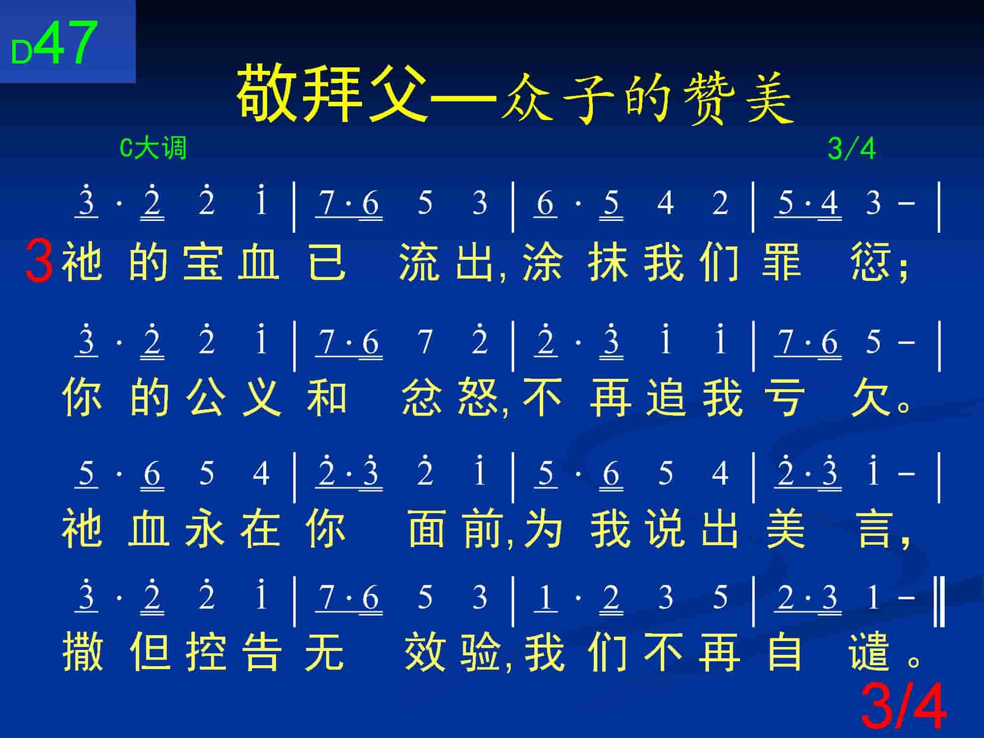 祂的宝血已流出,涂抹我们罪愆;你的公义和忿怒,不再追我亏欠。祂血永在你面前,为我说出美言,撒但控告无效验,我们不再自谴。