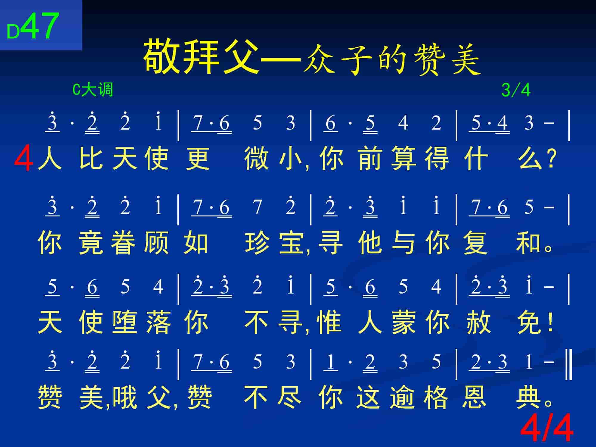 人比天使更微小,你前算得什么?你竟眷顾如珍宝,寻他与你复和。天使堕落你不寻,唯人蒙你赦免!赞美,哦父,赞不尽你这逾格恩典。
