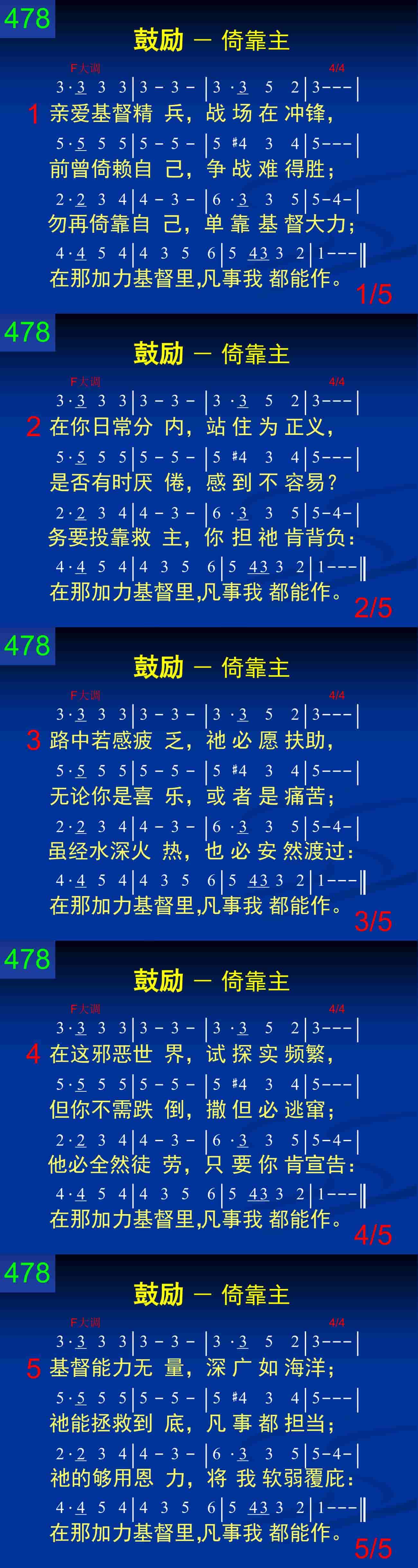 亲爱基督精兵,战场在冲锋,前曾倚赖自己,争战难得胜;勿再倚靠自己,单靠基督大力;在那加力基督里,凡事我都能作。