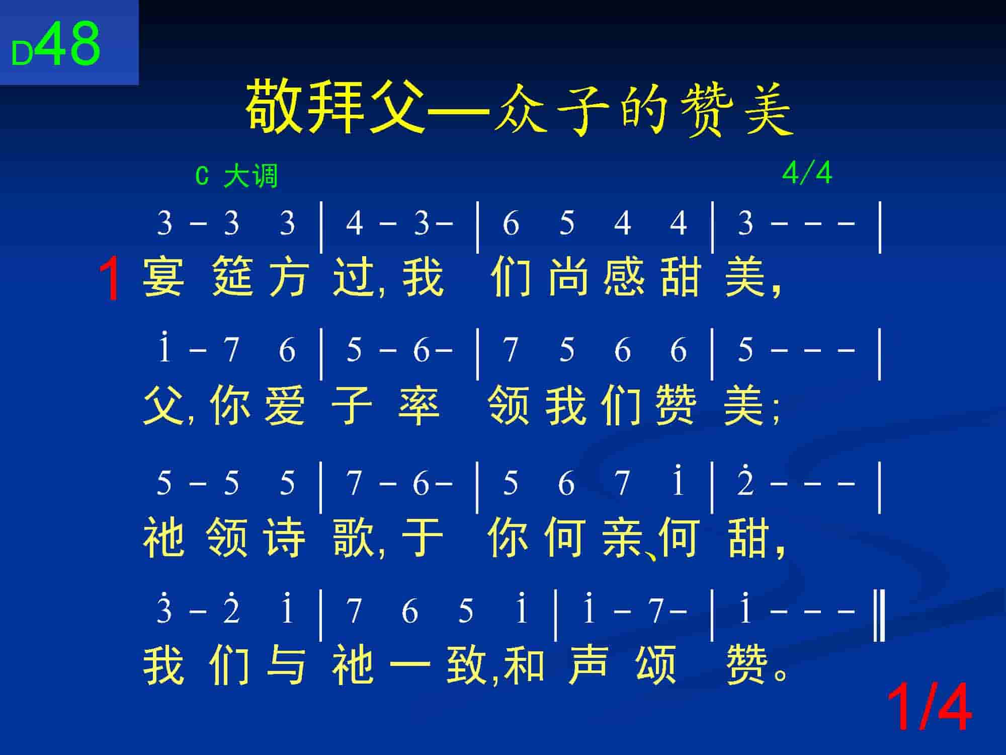 宴筵方过,我们尚感甜美,父,你爱子率领我们赞美;祂领诗歌,于你何亲、何甜,我们与祂一致,和声颂赞。