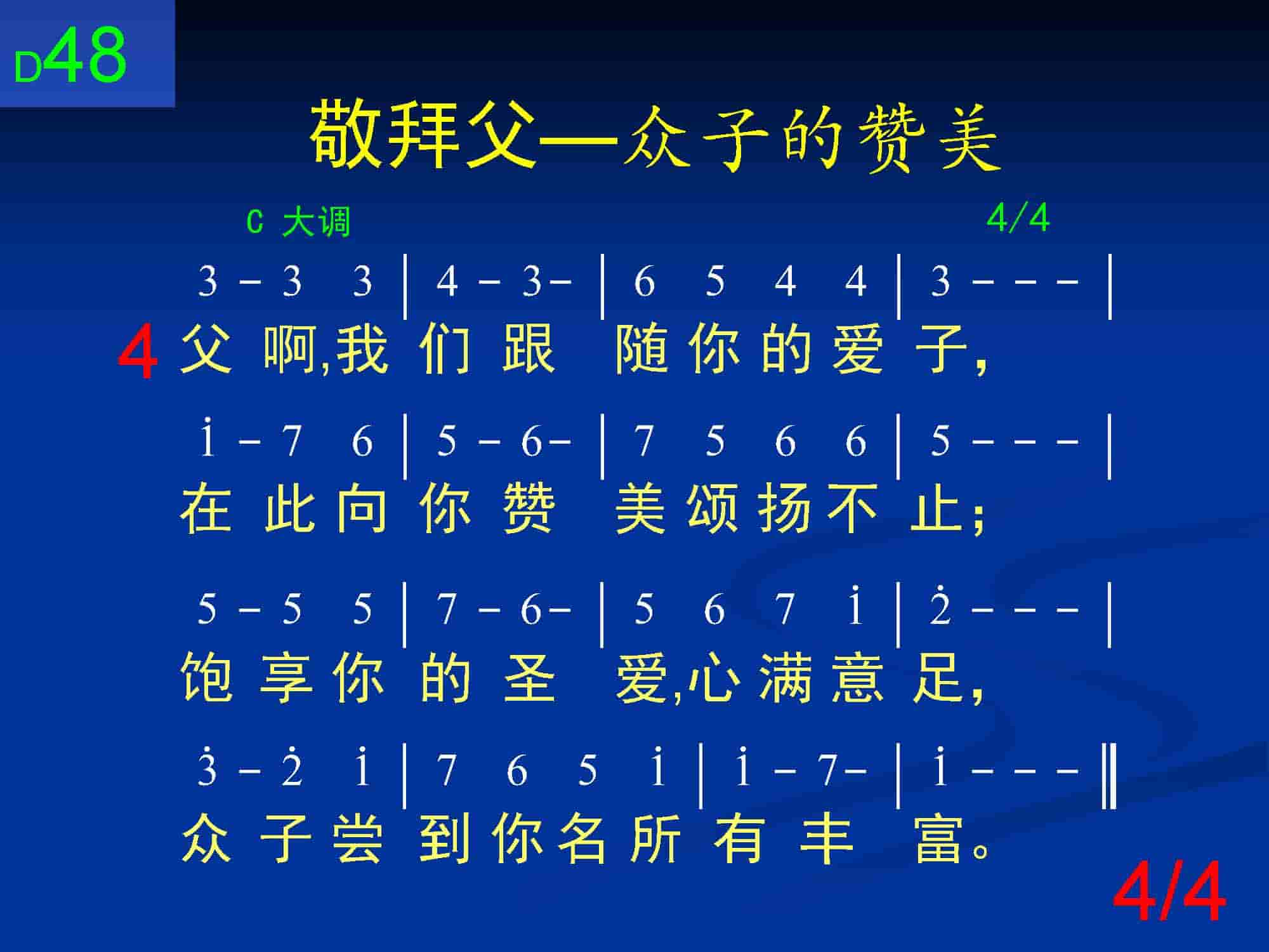 父啊,我们跟随你的爱子,在此向你赞美颂扬不止;饱享你的圣爱,心满意足,众子尝到你名所有丰富。