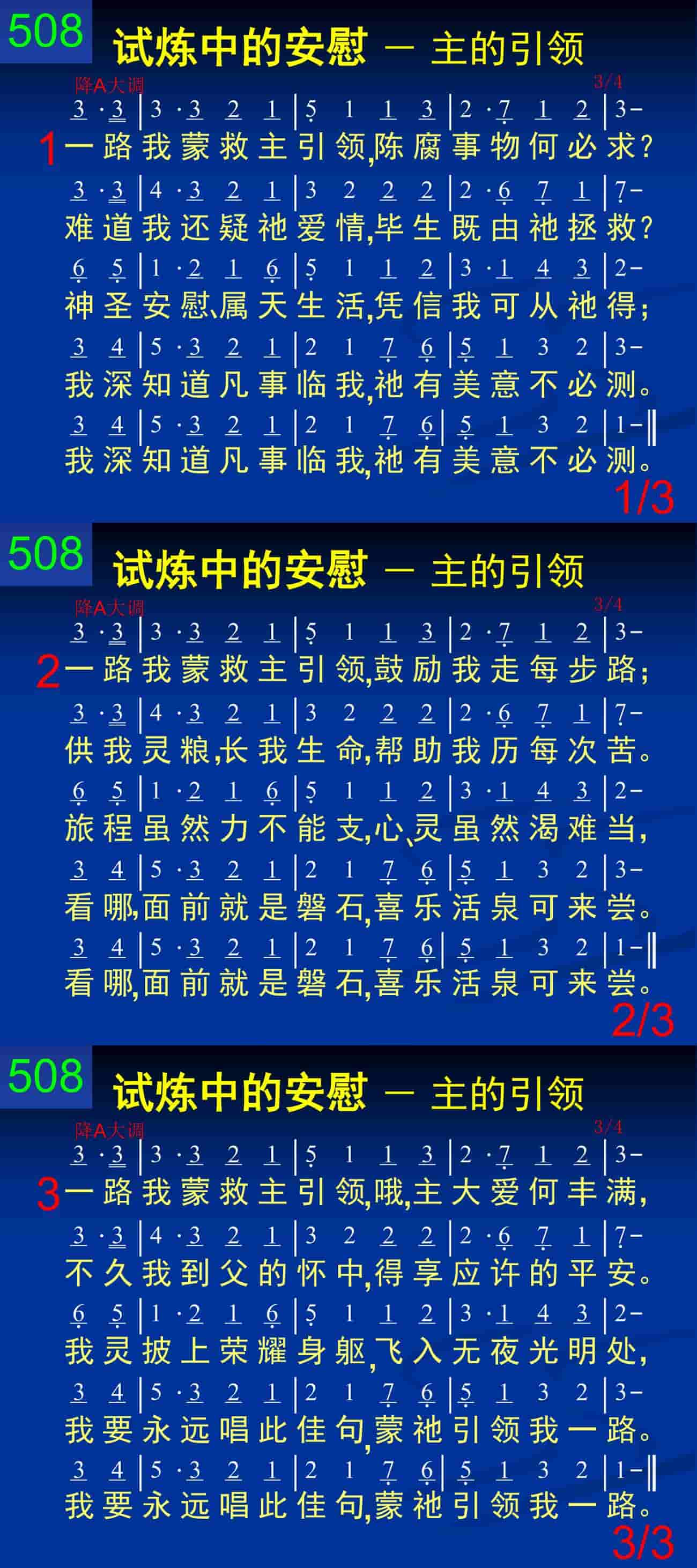 一路我蒙救主引领,鼓励我走每步路;供我灵粮,长我生命,帮助我历每次苦。旅程虽然力不能支,心、灵虽然渴难当,看哪,面前就是磐石,喜乐活泉可来尝。