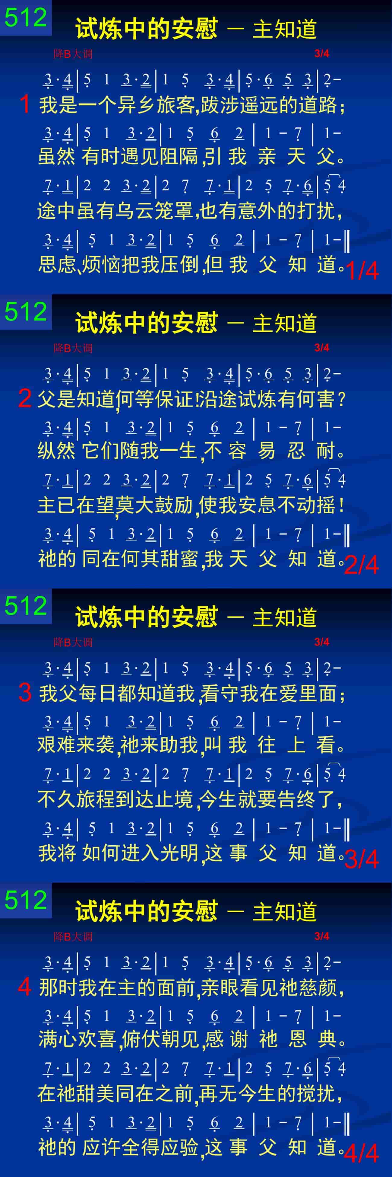 父是知道,何等保证!沿途试炼有何害?纵然它们随我一生,不容易忍耐。主已在望,莫大鼓励,使我安息不动摇!祂的同在何其甜蜜,我天父知道。