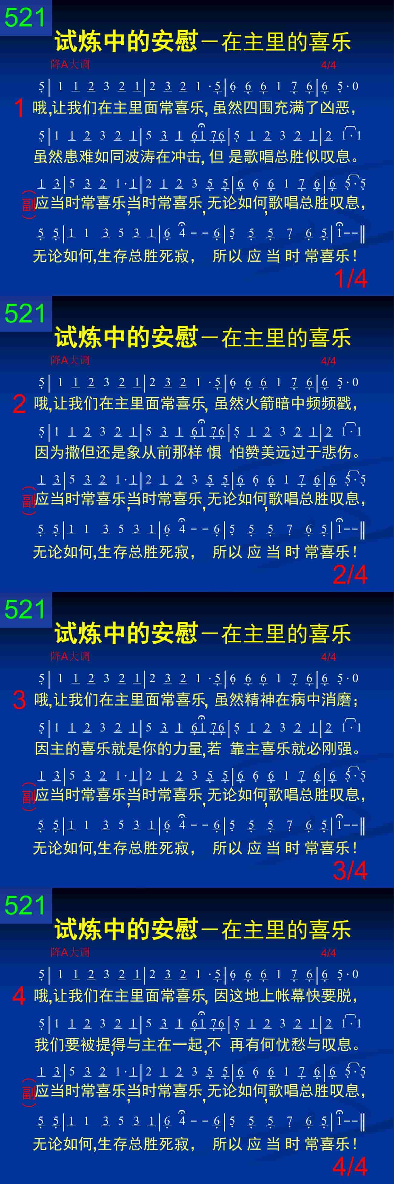 哦,让我们在主里面常喜乐,虽然精神在病中消磨;因主的喜乐就是你的力量,若靠主喜乐就必刚强。