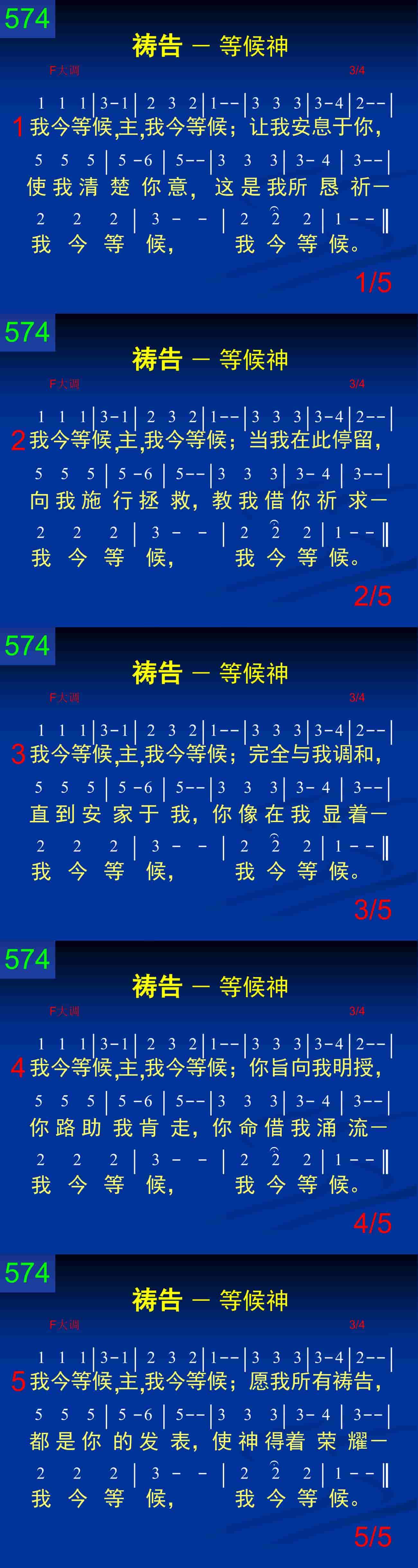 我今等候,主,我今等候;愿我所有祷告,都是你的发表,使神得着荣耀——我今等候,我今等候。