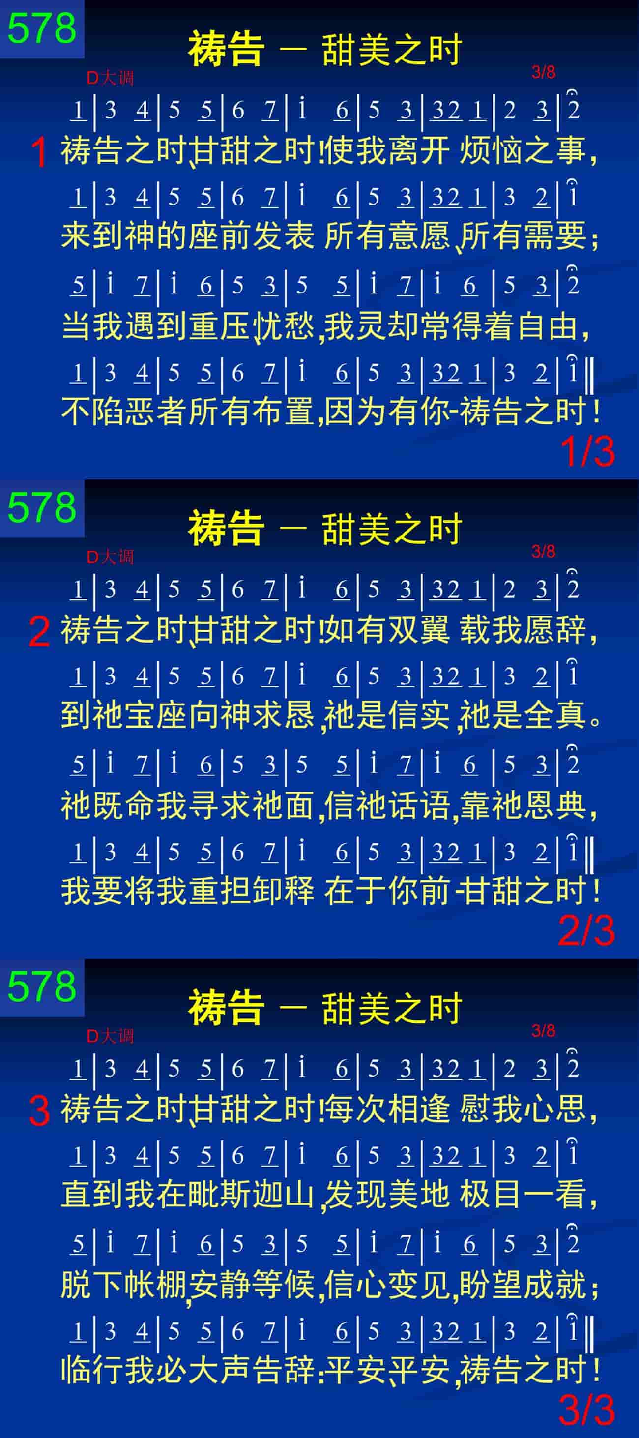 祷告之时、甘甜之时!如有双翼载我愿辞,到祂宝座向神求恳,祂是信实,祂是全真。祂既命我寻求祂面,信祂话语,靠祂恩典,我要将我重担卸释在于你前——甘甜之时!