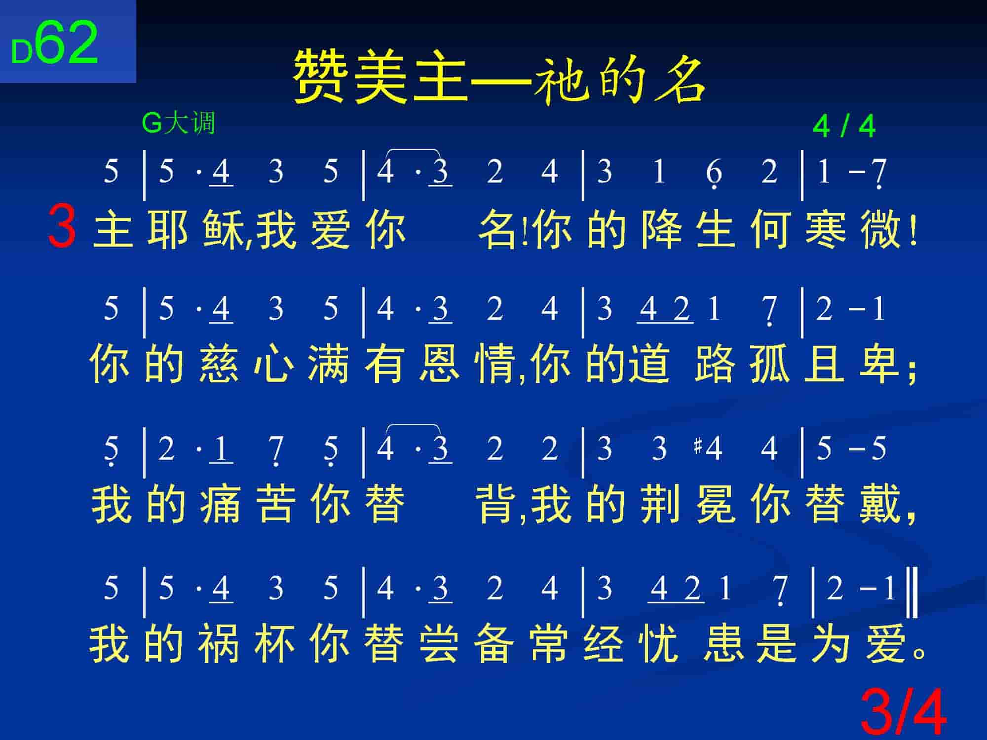 主耶稣,我爱你名!你的降生何寒微!你的慈心满有恩情,你的道路孤且卑;我的痛苦你替背,我的荆冕你替戴,我的祸杯你替尝备,常经忧患是为爱。