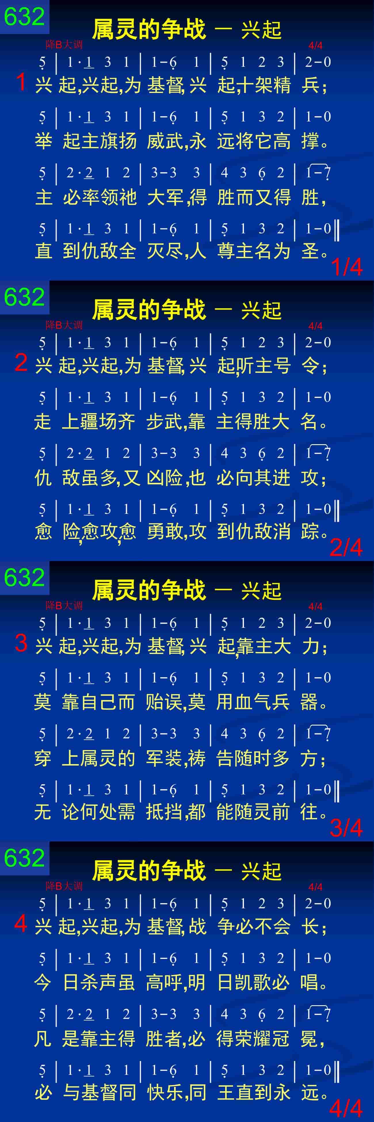 兴起,兴起,为基督,兴起,听主号令;走上疆场齐步武,靠主得胜大名。仇敌虽多,又凶险,也必向其进攻;越险,越攻,越勇敢,攻到仇敌消踪。