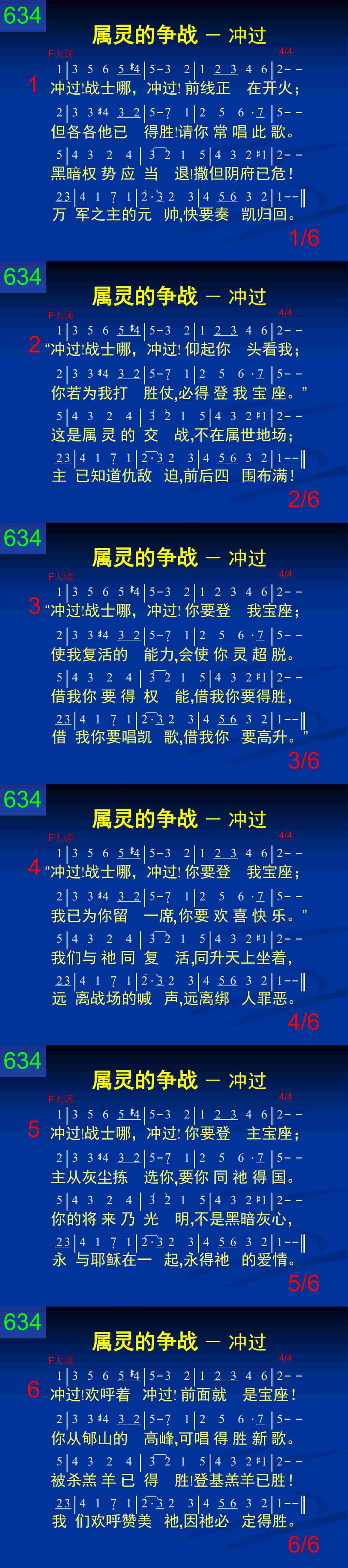 冲过!战士哪,冲过!前线正在开火;但各各他已得胜,请你常唱此歌。黑暗权势应当退,撒但阴府已危!万军之主的元帅,快要奏凯归回。