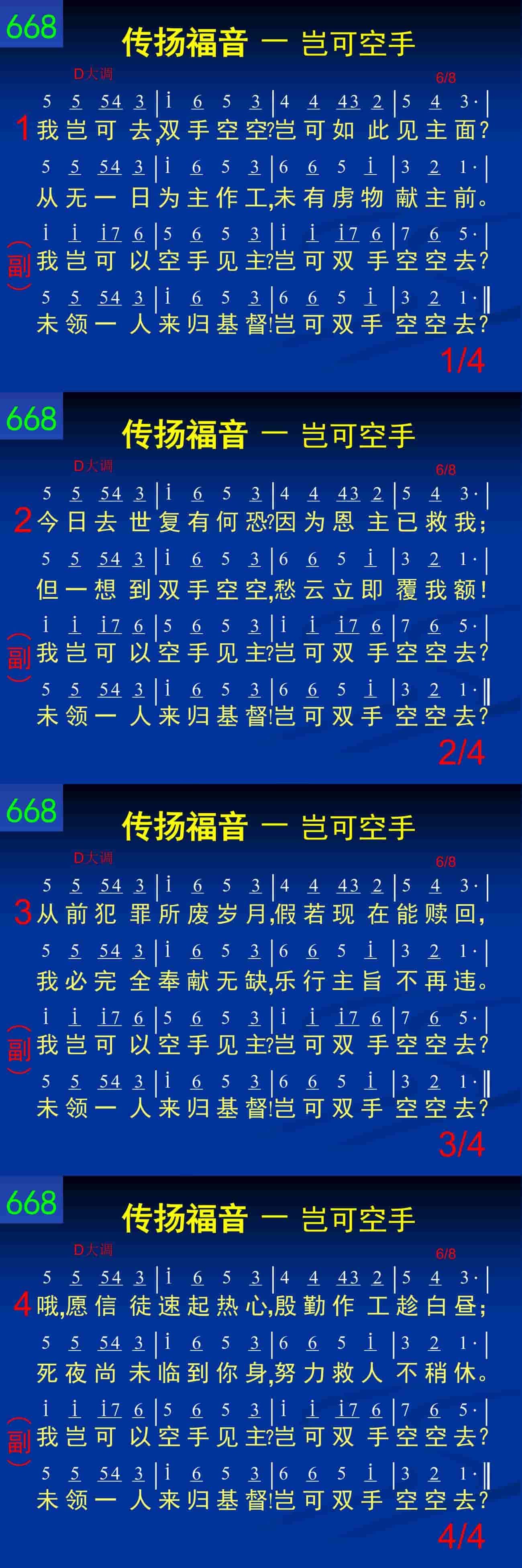 我岂可以空手见主?岂可双手空空去?未领一人来归基督!岂可双手空空去?