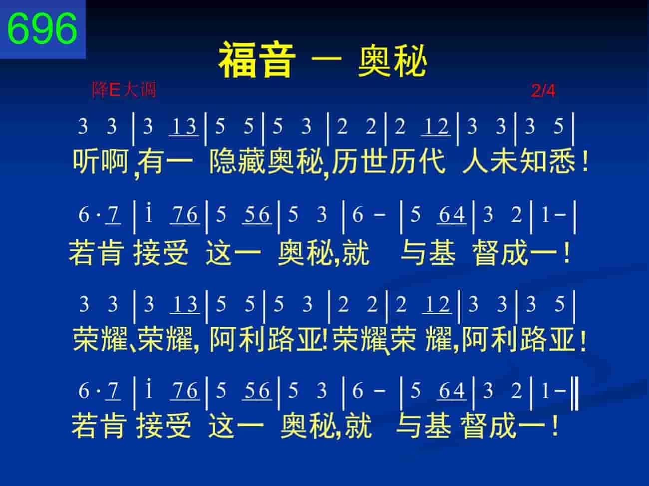 听啊,有一隐藏奥秘,历世历代人未知悉!若肯接受这一奥秘,就与基督成一!荣耀、荣耀,阿利路亚!荣耀、荣耀,阿利路亚!若肯接受这一奥秘,就与基督成一!